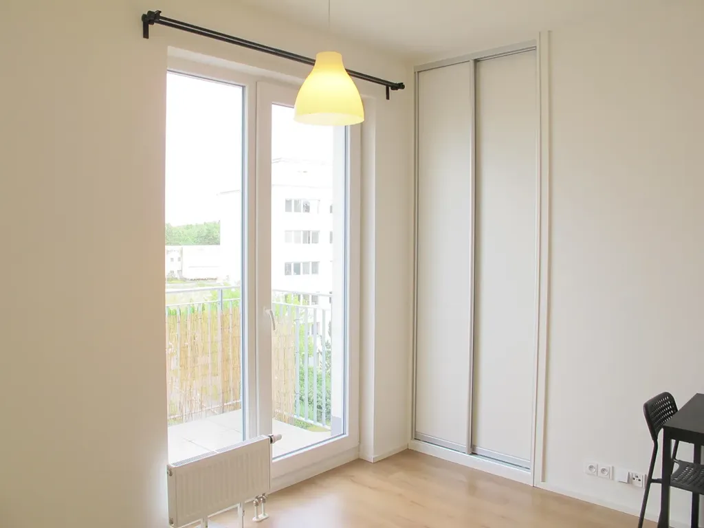 Tento moderní byt sestává z pokoje s kuchyňským koutem, koupelny s WC a předsíně. Kuchyňský kout je vybavený kuchyňskou linkou s vestavěnou elektrickou varnou deskou a pečicí troubou, velkou lednicí s mrazákem a jídelním stolem se 2 židlemi. V koupelně se nachází umyvadlo, sprchový kout, WC a pračka. V předsíni jsou úložné skříňky a knihovny s množstvím úložných prostor, ve výklenku vedle balkónových dveří je prostorná vestavná šatní skříň a nad varnou deskou odtahová digestoř. V pokoji je k dispozici manželské dvoulůžko s úložným prostorem. Byt se s výjimkou výše uvedeného zařízení pronajímá nezařízený.