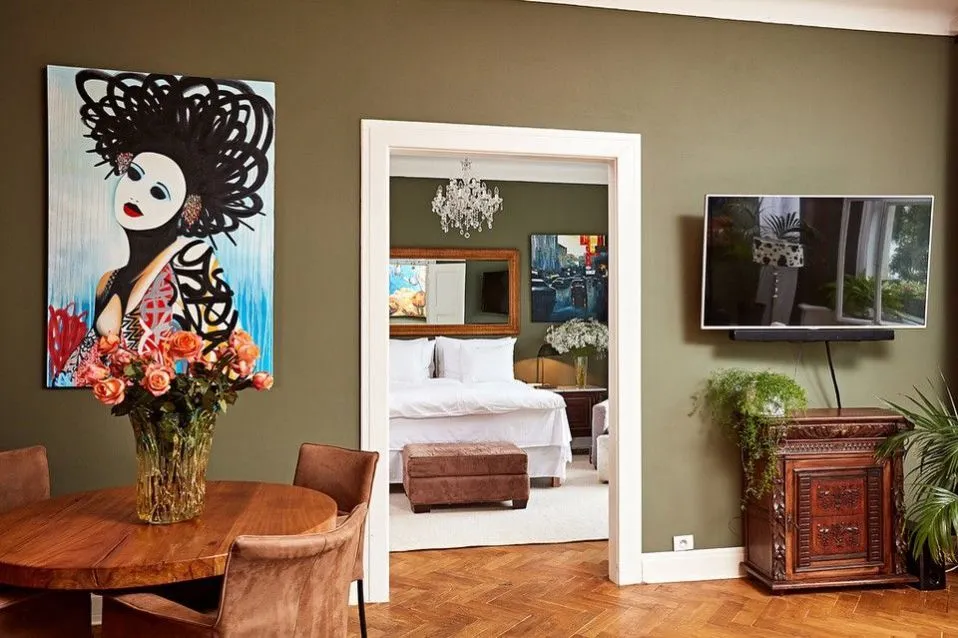 Interiér bytu tvoří obývací pokoj s jídelnou s arkýřem, komletně plně vybavená kuchyň, jedna ložnice s komorou a balkonem do vnitrobloku, druhá ložnice s krásným výhledem, prostorná koupelna (vana, toaleta, bidet. sprška), samostaná toaleta pro hosty a prostorná vstupní hala.