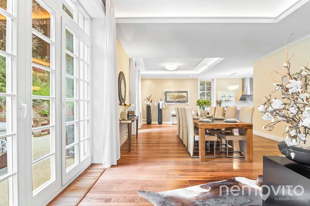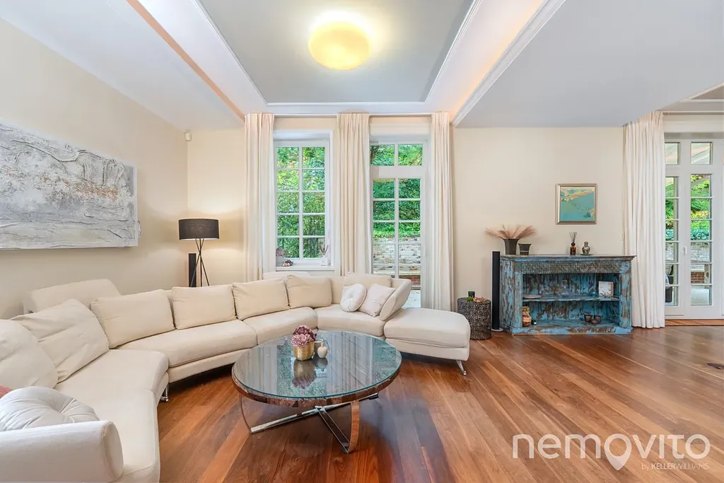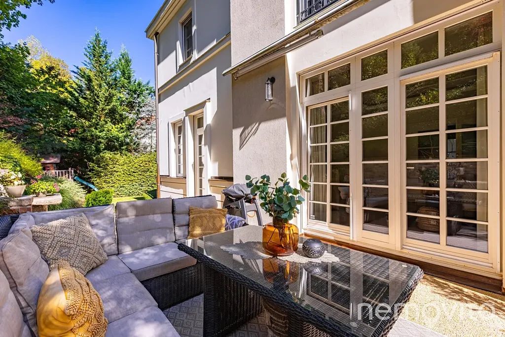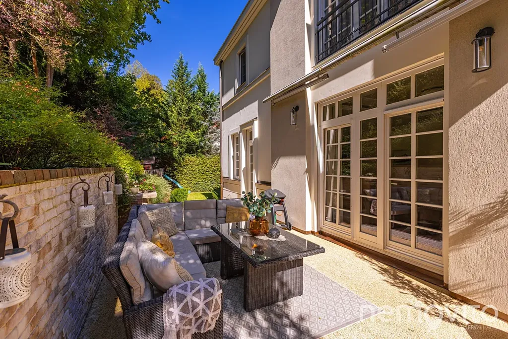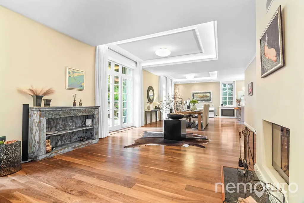 The dominant feature of the house is the living room, whose area is almost 100 sqm in total, with several French windows. These provide amazing views of the green garden, which is designed with maximum privacy. The living room has a fireplace and an entrance to the terrace. Thanks to the terrain difference, it is completely separated from the neighboring street. The space can easily accommodate up to twenty guests.