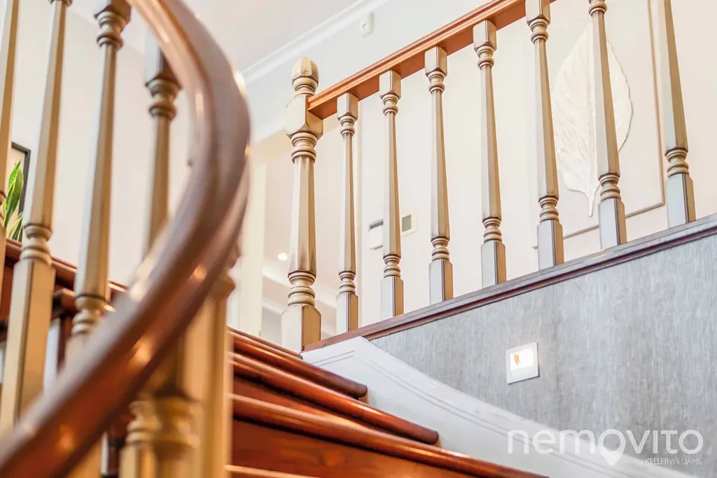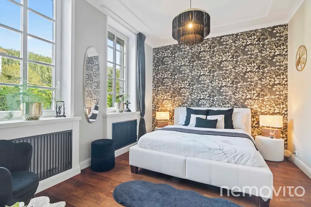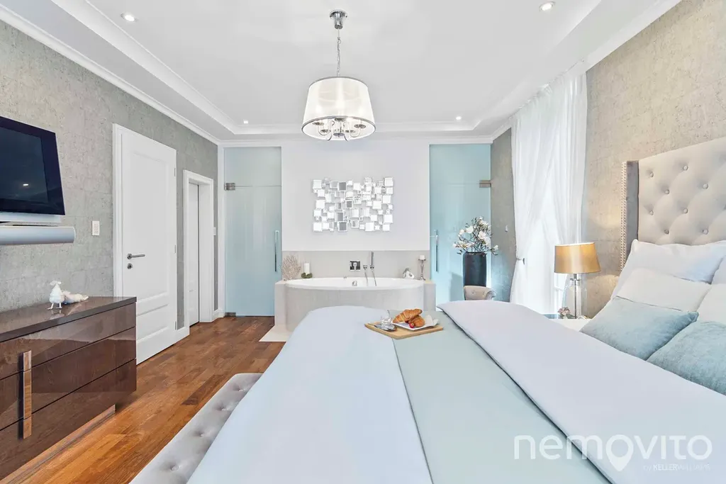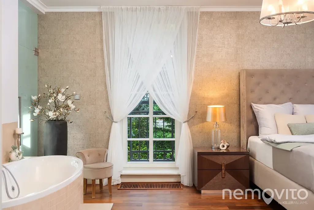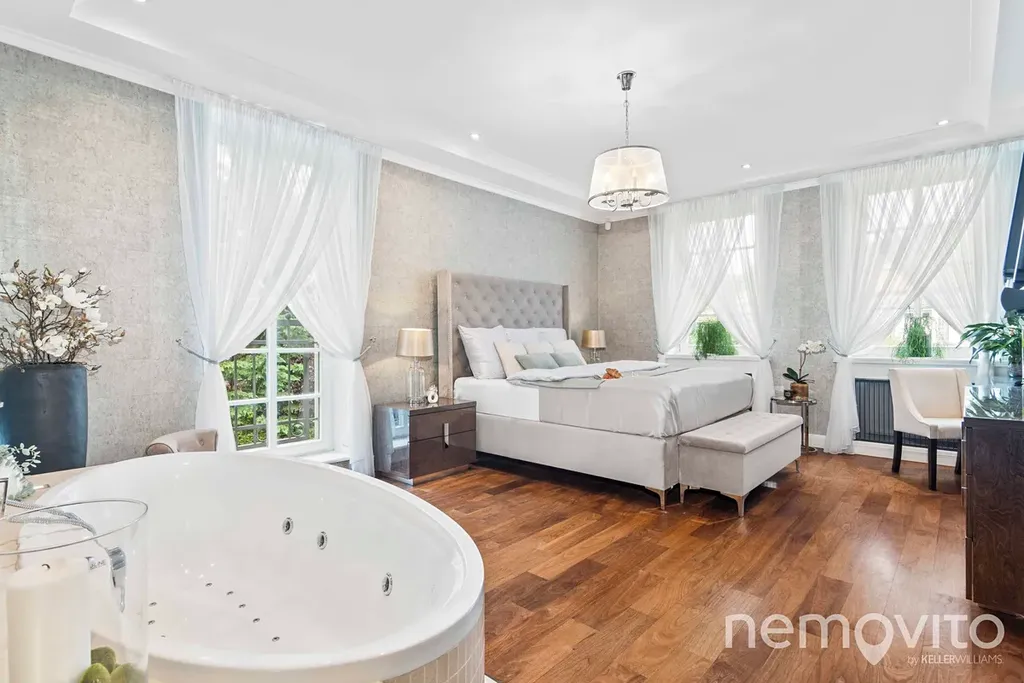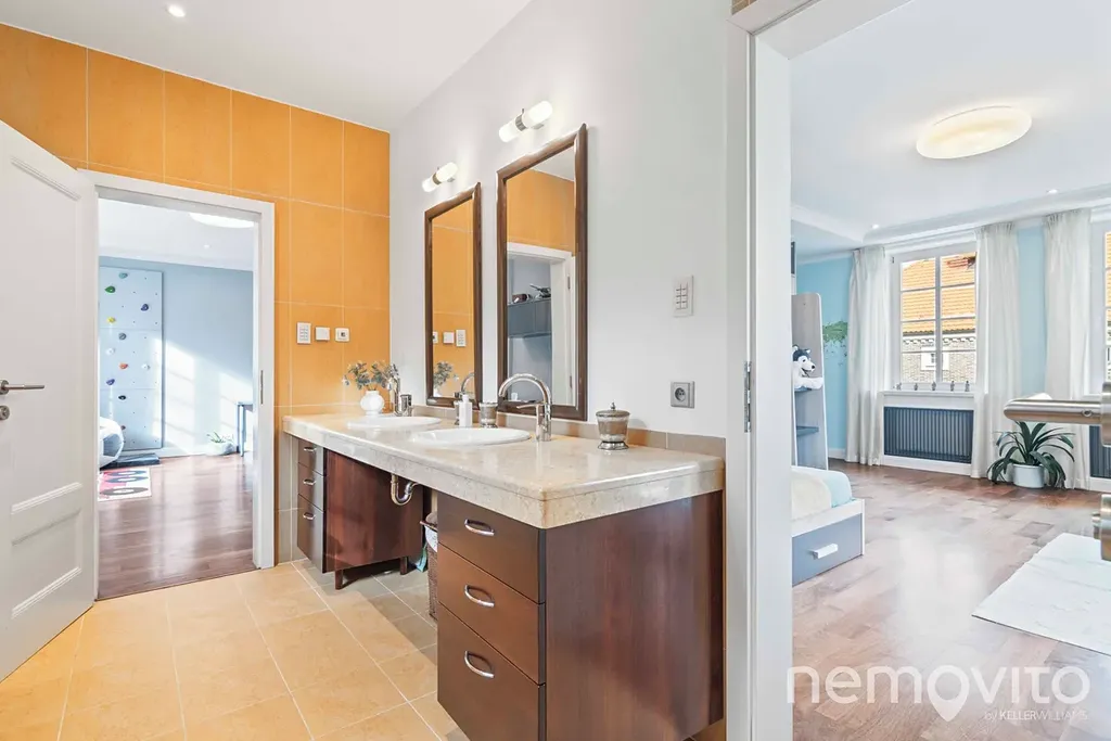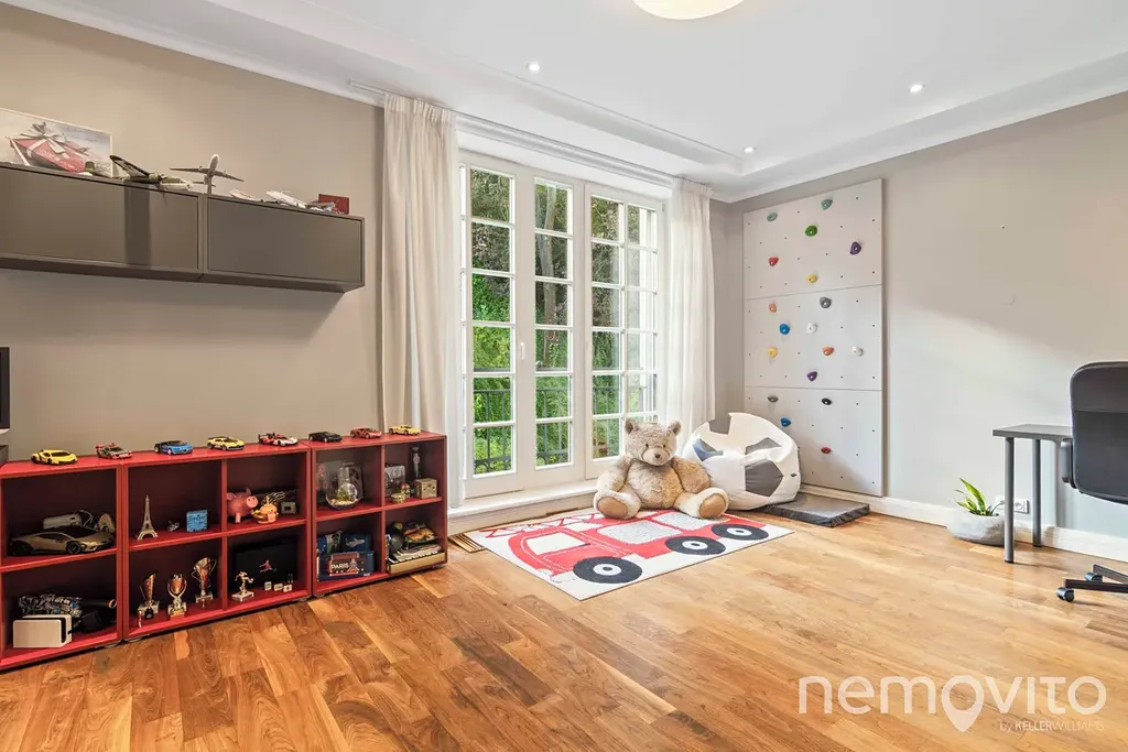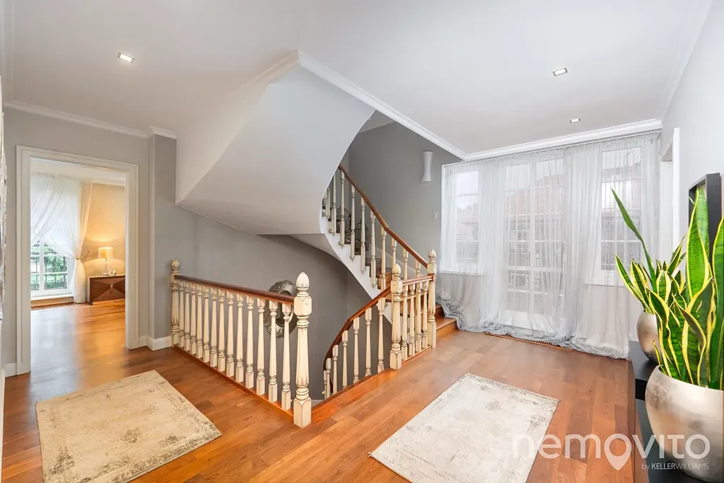 On the first floor there is also a quest room or an office (dressing room, bathroom). The hall is dominated by a beautiful wooden staircase. The master bedroom (24 sqm) with an en-suite bathroom and a free-standing bathtub also has a dressing room. The children's rooms (19 and 25 sqm) are connected by a bathroom and a large dressing room. Above the entire floor plan of the house there is a spacious attic. The current layout offers a 4-bedroom villa with 3 bathrooms.
