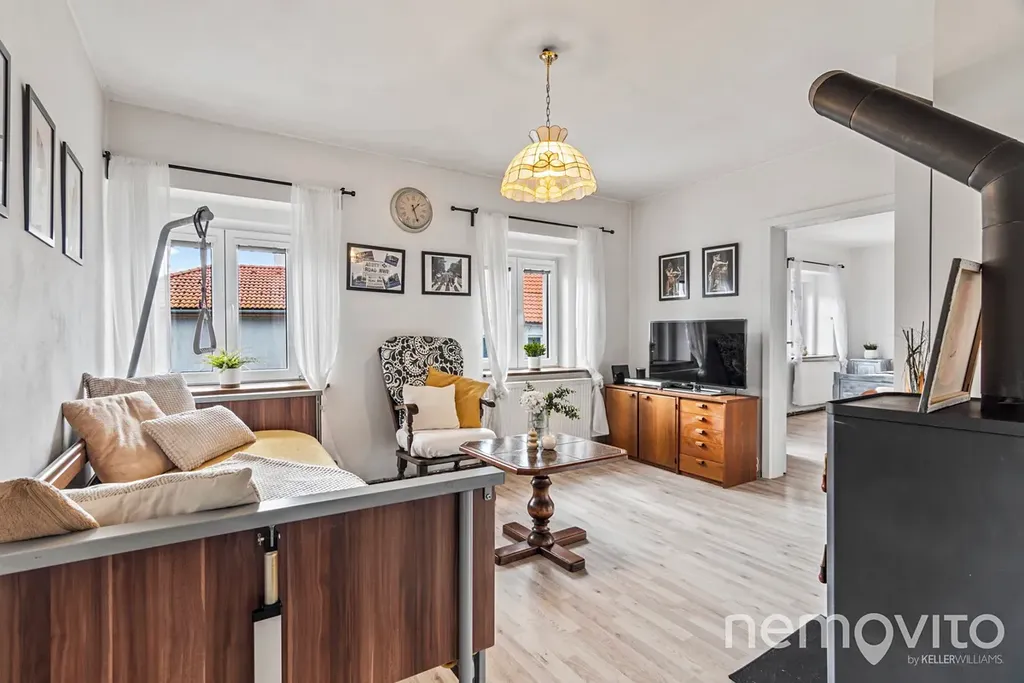- Průchozí obývací pokoj s kamny (13,8 m², jihozápadní orientace).