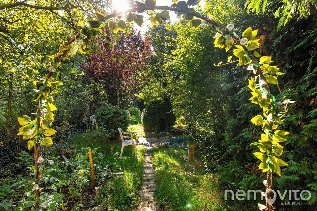 Zahrada je orientovaná na jihovýchod a nabízí příjemné soukromí i místo pro relax díky spoustě zeleně. Najdete na ní pár starších záhonů a dřevěný domek na úschovu zahradního vybavení.