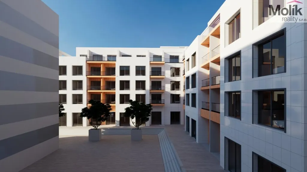 Design a kvalita: Fasáda kombinuje moderní hliníkové prvky, skleněná zábradlí na balkonech a dřevěné obklady, které dodávají stavbě luxusní vzhled.