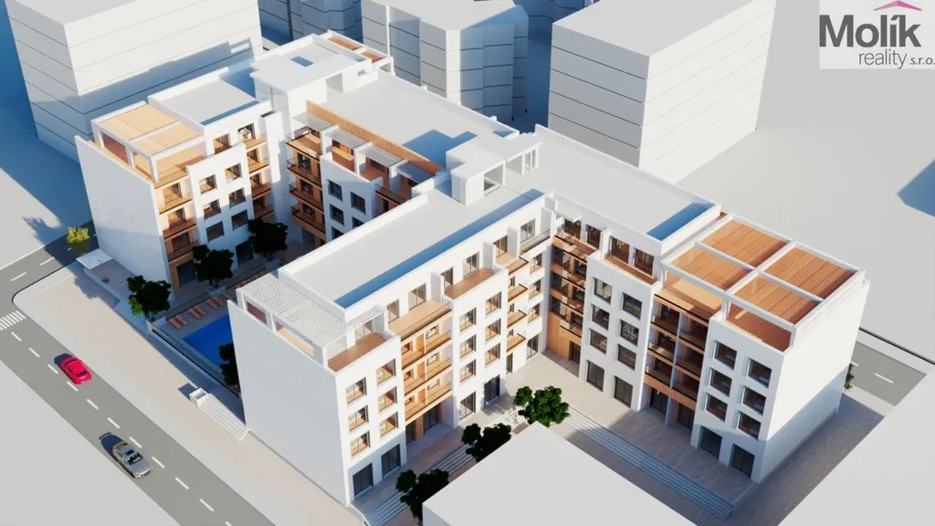 Apartmán je situován v budově s uzavřeným vnitroblokem, což zajišťuje obyvatelům maximální soukromí a klid. Dominantou celého komplexu je velkorysý venkovní bazén, kolem kterého se soustředí veškerý společenský život.