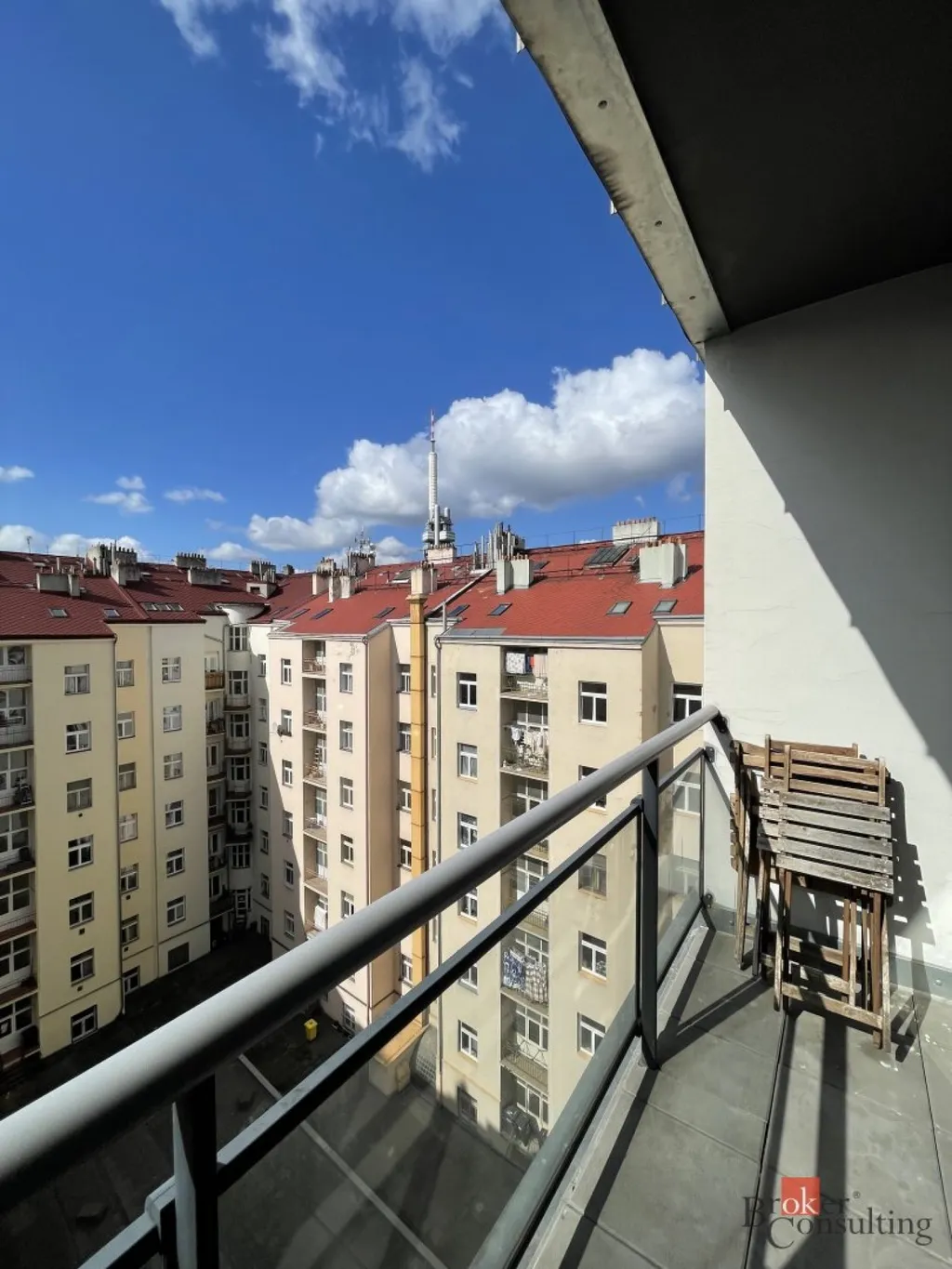 Byt se nachází v moderní nástavbě cihlového domu z roku 2013 v 6. patře ze 7 a je orientován na západ do klidného vnitrobloku.