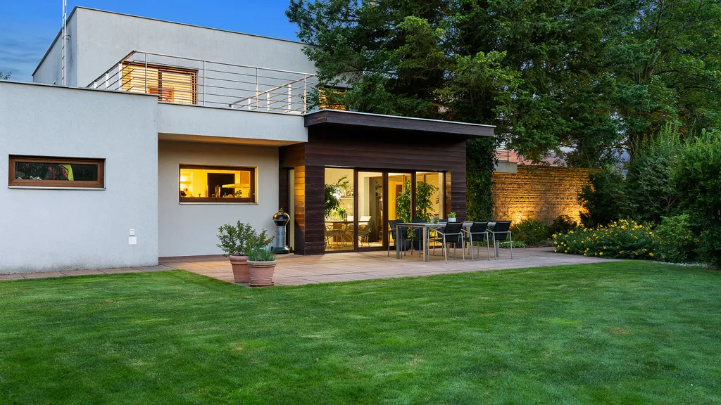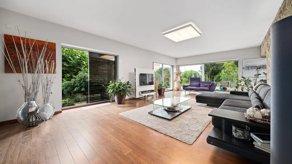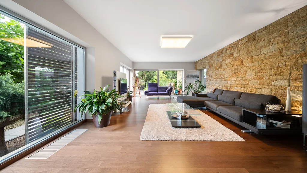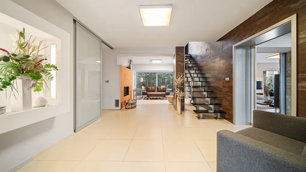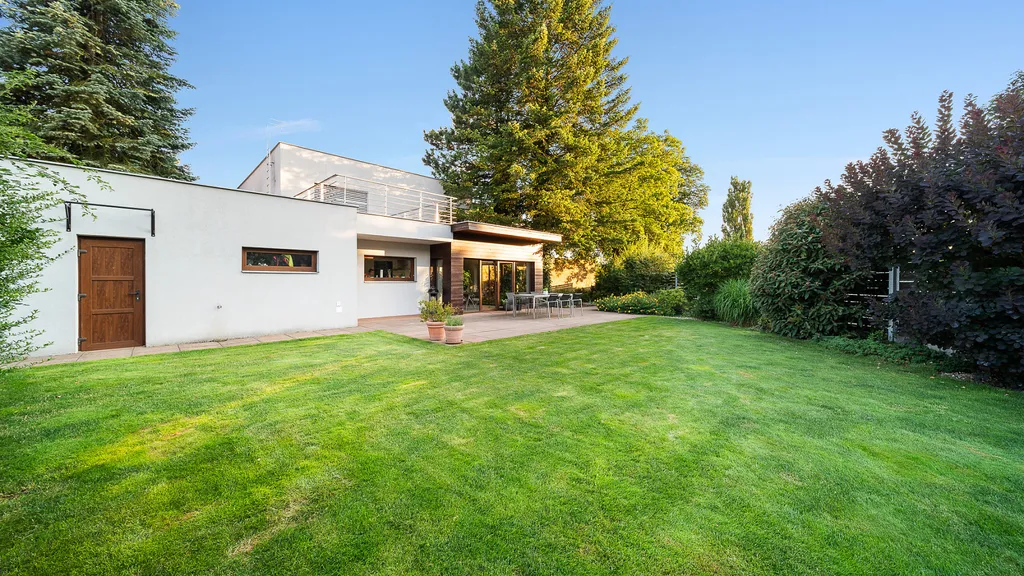 Vnitřní část rezidence překračuje konvenční normy v bydlení. Výhledy do přírody, sofitikované úspořádání a moderní materiály nepřestávají bavit. Spolupráce s projekční kanceláří Atelier H1 se vyplatila. Rozsáhla rekonstrukce byla provedena precizně a odborně na všech úrovních stavby. Dostatek pokojů, uložného prostoru a skvěle postavená zahrada vytvářejí z tohoto objektu skutečný domov.