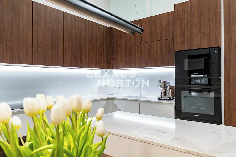 Interiér je vybaven nábytkem na míru BoConcept, který spojuje nadčasový design, vysokou funkčnost a maximální komfort. Elegantní charakter prostoru podtrhují dřevěné parkety, špaletová okna se stylovými roletami Leha včetně blackout varianty. K vysokému standardu dále přispívá klimatizace, designové radiátory a stylový, plně funkční krb na dřevo, který vytváří jedinečnou a útulnou atmosféru domova.