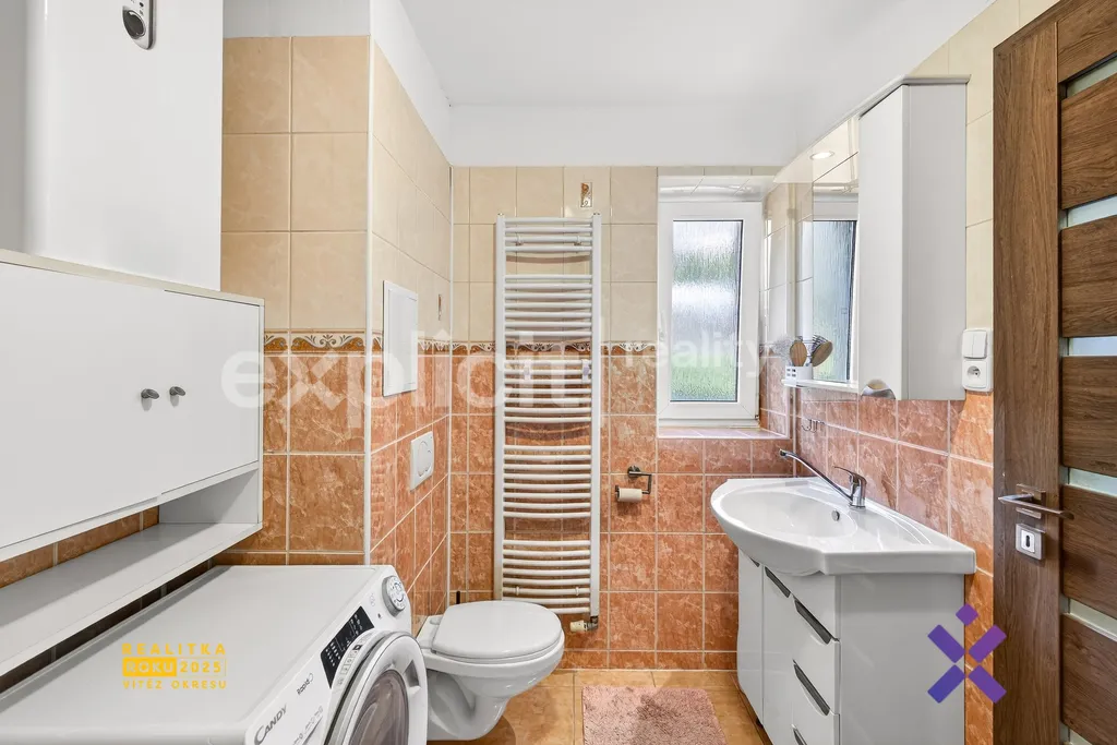 Vedle kuchyně je koupelna spojená s toaletou, vybavená vanou, pračkou a topným žebříkem.