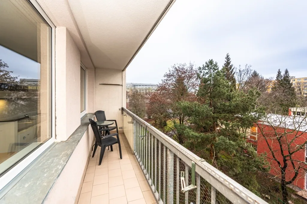 Pronájem bytu od 1.5. 2026 - velmi pěkný, prosvětlený byt 1kk, 28 m2 + prostorná lodžie 6 m2 a komora cca 2 m2 na patře přímo u bytu, Praha 9 - Střížkov, ulice Rumburská, 5.NP v zatepleném panelovém domě s novým výtahem. Orientace bytu je na JV do klidného zeleného prostranství s pěkným výhledem do okolí. Díky oknům, které jsou po celé šíři bytu, je byt příjemně prosvětlený a slunný.