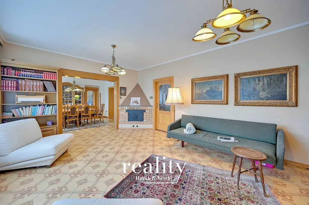 Hledáte velký dům pro rodinu na krásném místě nedaleko Znojma? V Hodonicích nabízíme rodinný dům 8+1 o velikosti užitné plochy ca. 480 m² na pozemku 932 m². Dům je cihlový a má praktické uspořádání s dostatkem prostoru i soukromí. V přízemí najdete komplex místností, které jsou krásně logicky propojené - velká kuchyň průchozí do jídelny, na kuchyň navazuje úložná místnost (šatna), z jídelny je vstup do pracovny a na druhé straně i do obývacího pokoje s krbem, v přízemí naleznete i koupelnu s vanou a samostatné WC. V prvním patře jsou dvě ložnice, dětský pokoj a druhá koupelna. Je zde také terasa s prosklenou stěnou a výhledem do přírody, kterou lze využít jako zimní zahradu nebo pracovnu. Ve druhém patře je další pokoj s krbem a vstupem na terasu. Každé patro má vlastní koupelnu a WC.