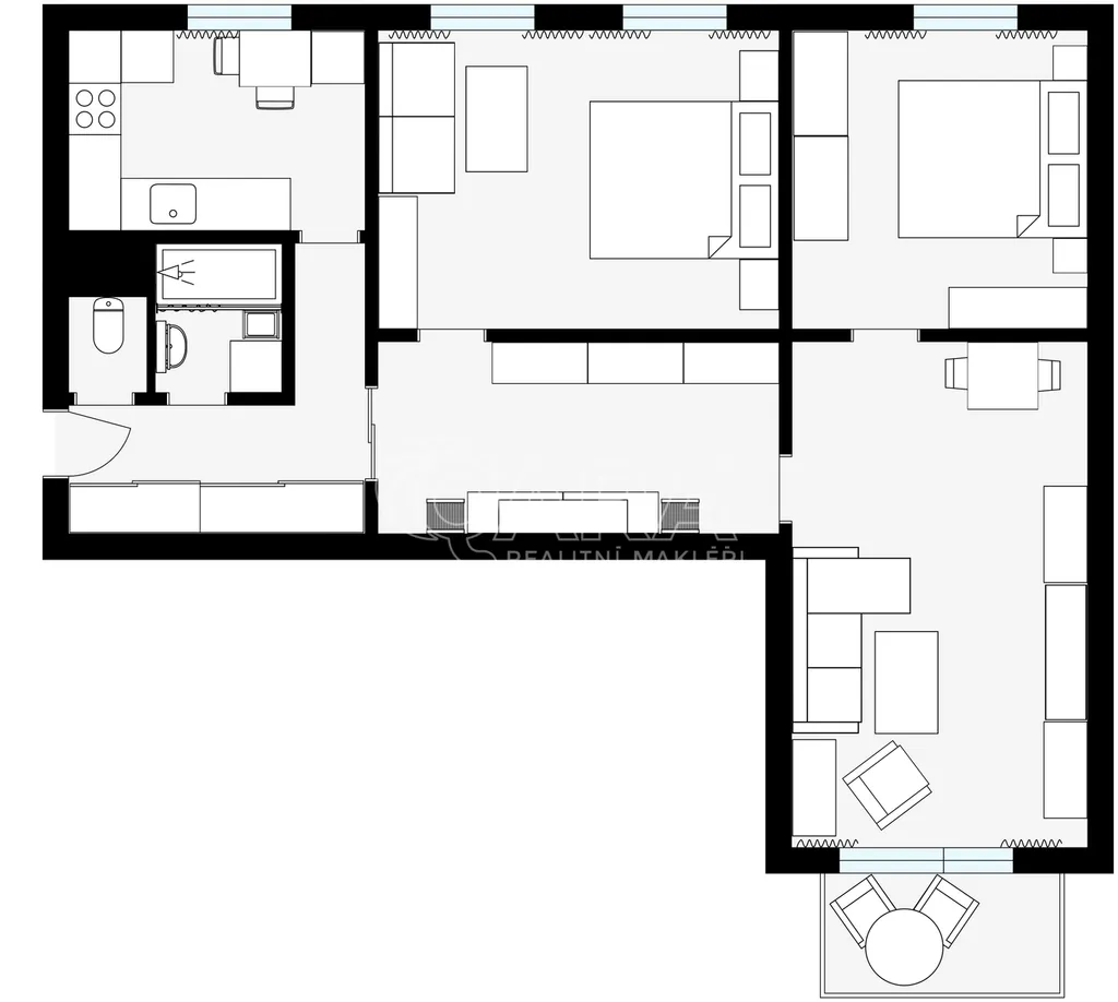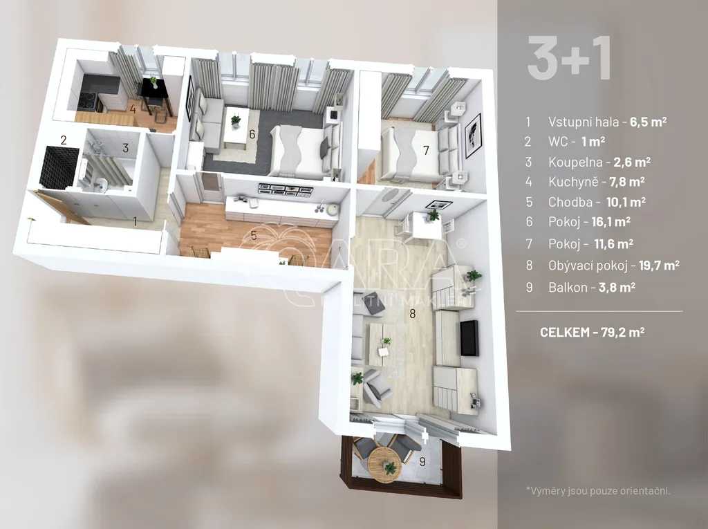 Dominantou bytu je prostorný obývací pokoj, který působí vzdušně a přirozeně propojuje místo pro odpočinek i setkávání s rodinou či přáteli. Na něj navazují dva samostatné pokoje, které lze využít jako ložnici, dětský pokoj nebo pracovnu. Kuchyně je řešena prakticky a nabízí dostatek místa i pro jídelní kout, takže každodenní fungování je pohodlné a bez kompromisů.
