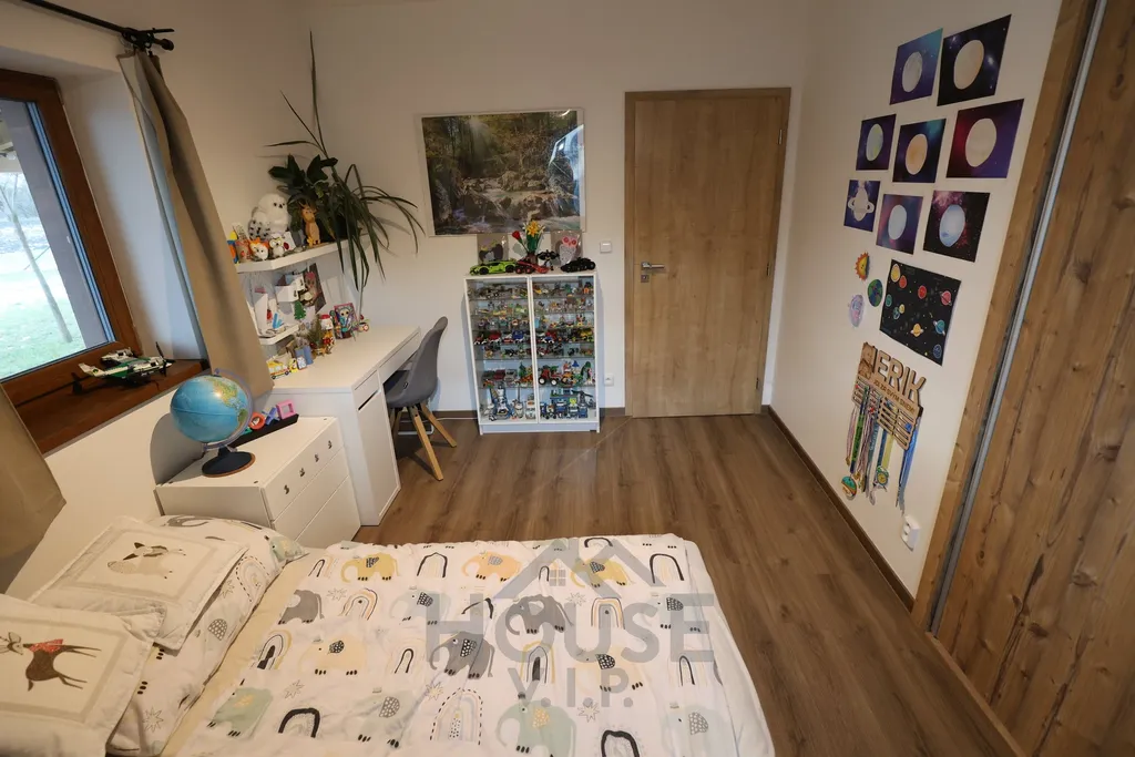 Interiér domu je laděn do teplých přírodních odstínů dřeva a působí velmi útulně. Většina nábytku byla vyrobena truhlářem na míru a je součástí prodejní ceny. Užitná plocha domu činí přibližně 132 m², dispozice je 6+kk. Dům je energeticky úsporný (PENB třídy B) s nízkými provozními náklady a je vybaven zabezpečovacím systémem Jablotron.