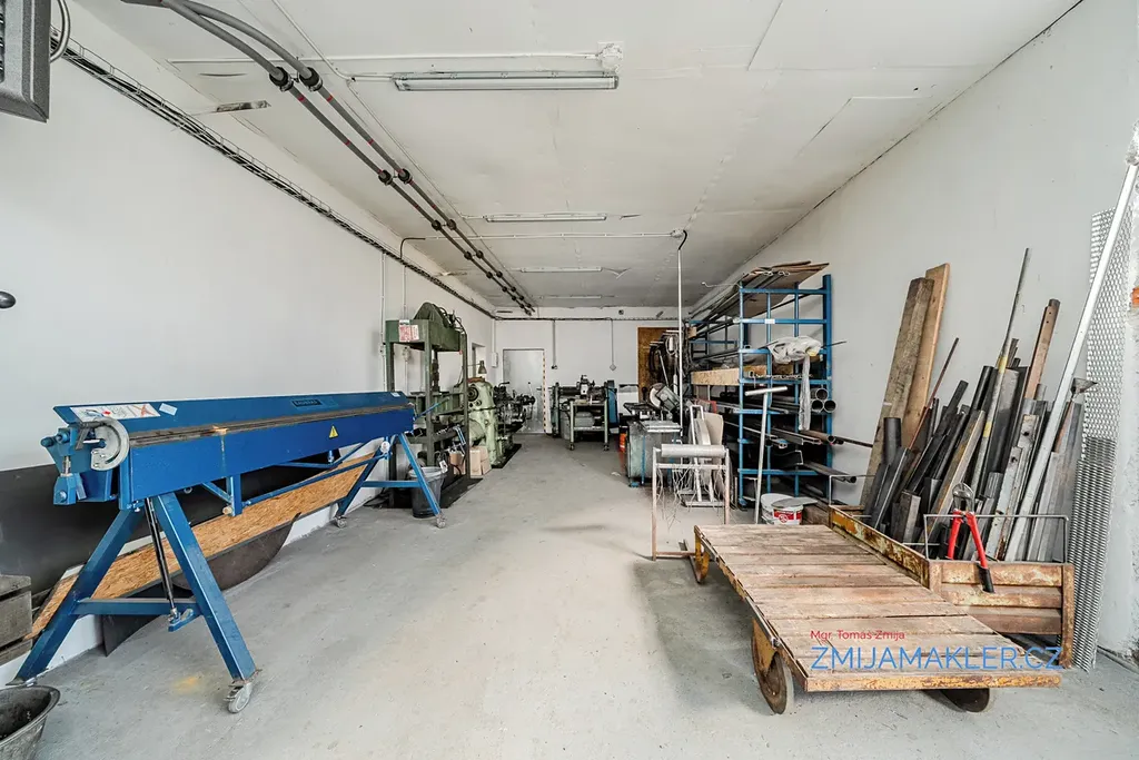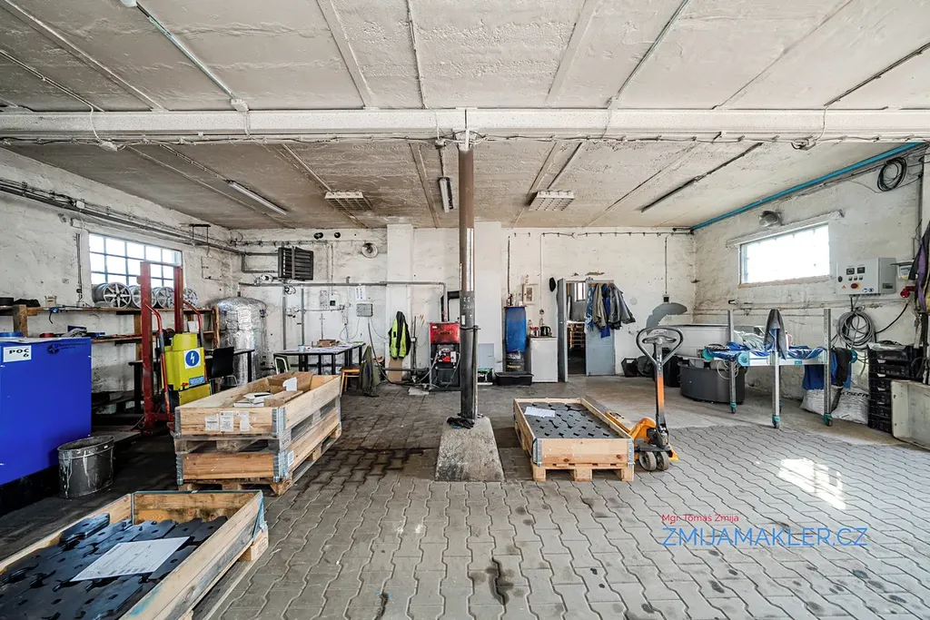 Součástí pozemku je hala o velikosti 641 m2 s kanceláří, prodejnou a dalšími devíti samostatnými dílnami. Dílny mají svůj samostatný vjezd či vchod na obě strany budovy. Budova je zděná, opatřená brizolitovou omítkou, základy budovy jsou provedeny z betonových základových pásů, střecha budovy je sedlová, pokrytá vlnitým plechem. Okna a dveře/vrata v jednotlivých místnostech jsou kovová, místy jsou okna vybavena luxvery. Vnitřní povrch zdí dílen je vyhotoven z vápenné omístky. Elektroinstalace v budově je třífázová, světelná. Vytápění v hlavní dílně je zajištěno kotlem na pevná paliva. V budově je možno obnovit původní připojení k plynu a zajistit tak vytápění objektu plynovým kotlem. Přívod vody, WC a odpady v budově instalovány nejsou, je možné se napojit na nedaleký vodovodní řád s pitnou vodou. K dispozici je hloubkový vrt 33 m s užitkovou vodou vedle budovy. Některé části budovy jsou nyní v pronájmu, po dohodě lze ve stávajících pronájmech pokračovat. Areál je možno si pořídit samostatně bez vybavení nebo i s vybavením. Termín prohlídky si domluvte s makléřem.