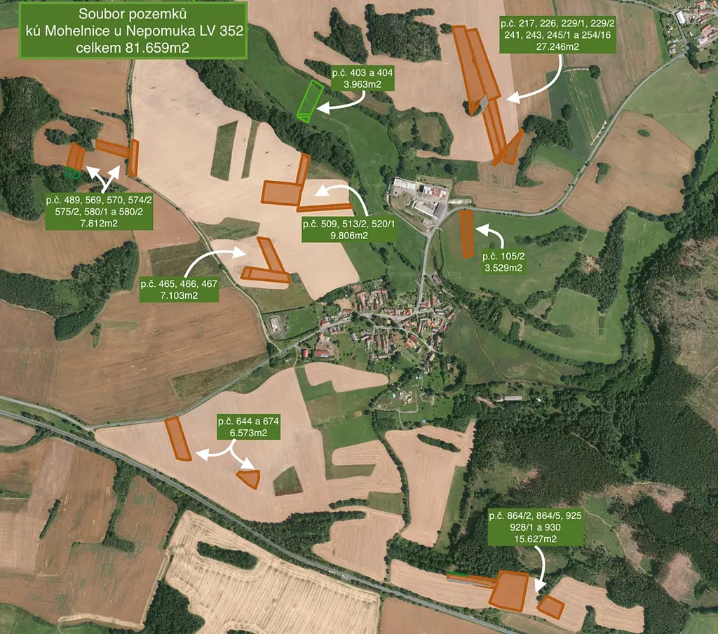 Nabízíme ke koupi soubor zemědělské půdy o celkové výměře 81.659m2 nacházející se v katastrálním území Mohelnice u Nepomuka zapsané na listu vlastnictví č. 352. Pozemky jsou využívané jako orná půda a jsou pronajaté místní společnosti do konce zemědělského roku 2030.