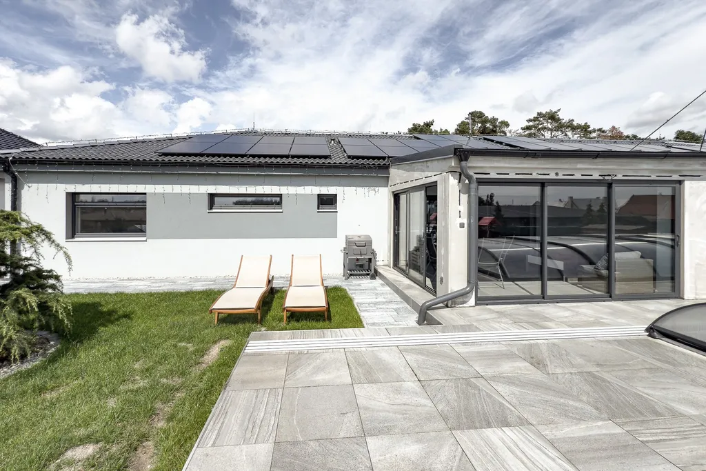 Dispozice domu nabízí vstupní předsíň, technickou místnost, šatnu, koupelnu, samostatné WC, tři pokoje a prostorný obývací pokoj s kuchyní, komorou a zimní zahradou. Právě zimní zahrada je velkým bonusem domu a nabízí příjemné místo k odpočinku po celý rok.