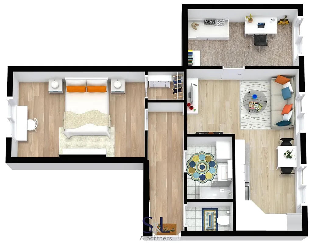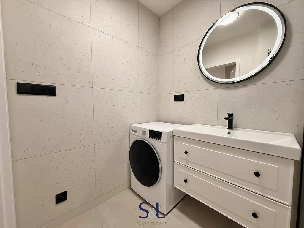 Dispozice bytu je velmi praktická – kromě obývacího pokoje s kuchyní jsou zde dva samostatné pokoje, ideální jako ložnice, dětský pokoj nebo pracovna. Byt dále disponuje prostornou předsíní, dřevěnými designovými prvky a úsporným osvětlením.