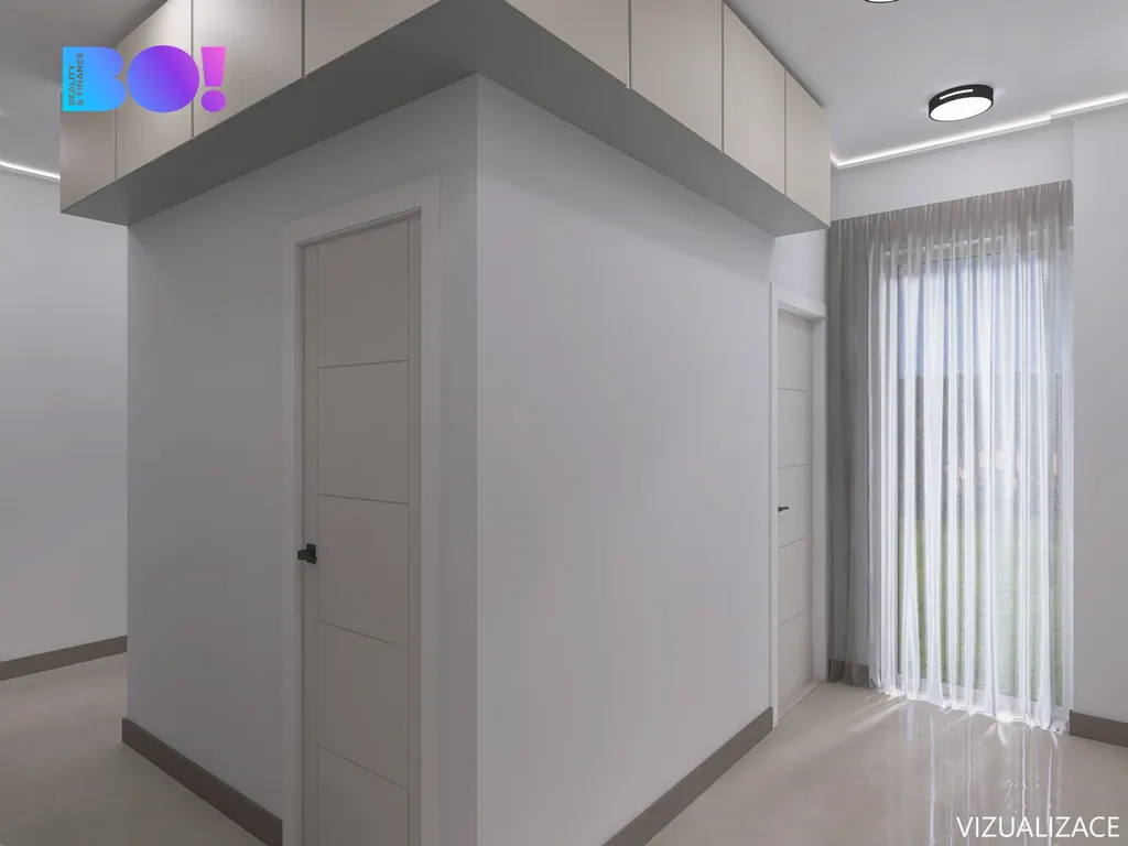 V předsíni je vestavěná skříň připravená na pračku a sušičku, hned u vstupu do kuchyně praktický kumbál na úklidové potřeby a nad vstupem úložný prostor třeba na sezónní věci. Kuchyň je plně vybavena – myčka, trouba, varná deska, lednice i dřez. V ložnici je k dispozici prostorná vestavěná skříň. Zbylý nábytek, který je viditelný na vizualizacích nebude součástí bytu.