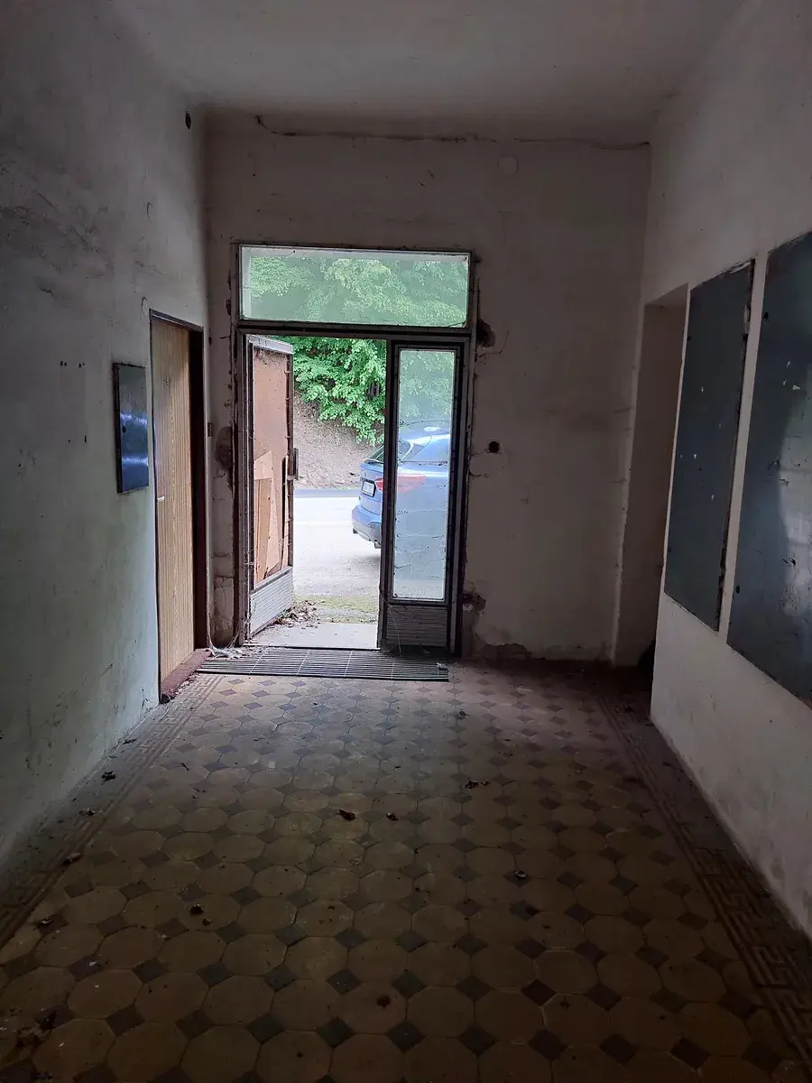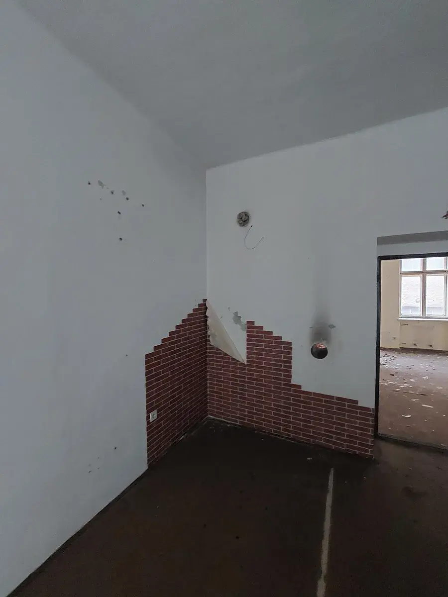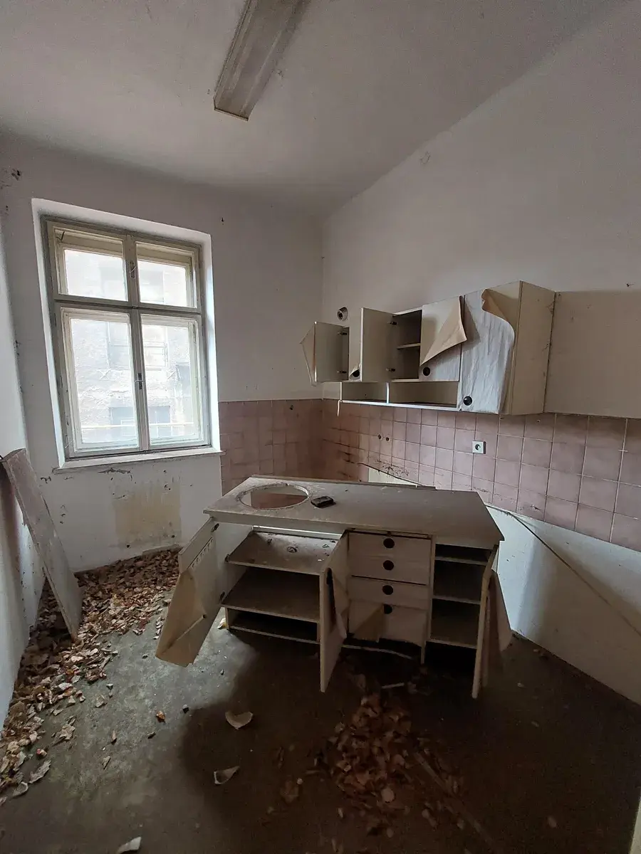 Bytová jednotka dispozice 2+1, nacházející se v 1. nadzemním podlaží zděného objektu s celkem jedním podzemním a třemi nadzemními podlažími. Střecha je sklonitá, krytina plechová, bleskosvod je instalován ,klempířské prvky jsou plechové, fasáda je vápenná, ve špatném stavu. Výtah domě není, schody jsou betonové bez povrchu. Okna jsou dřevěná, podlahy jsou z dlažby, většinou však chybějící. Kuchyň v bytě není, koupelna a WC nefunkční, stejně jako všechny rozvody. Vytápění není, teplá voda není.