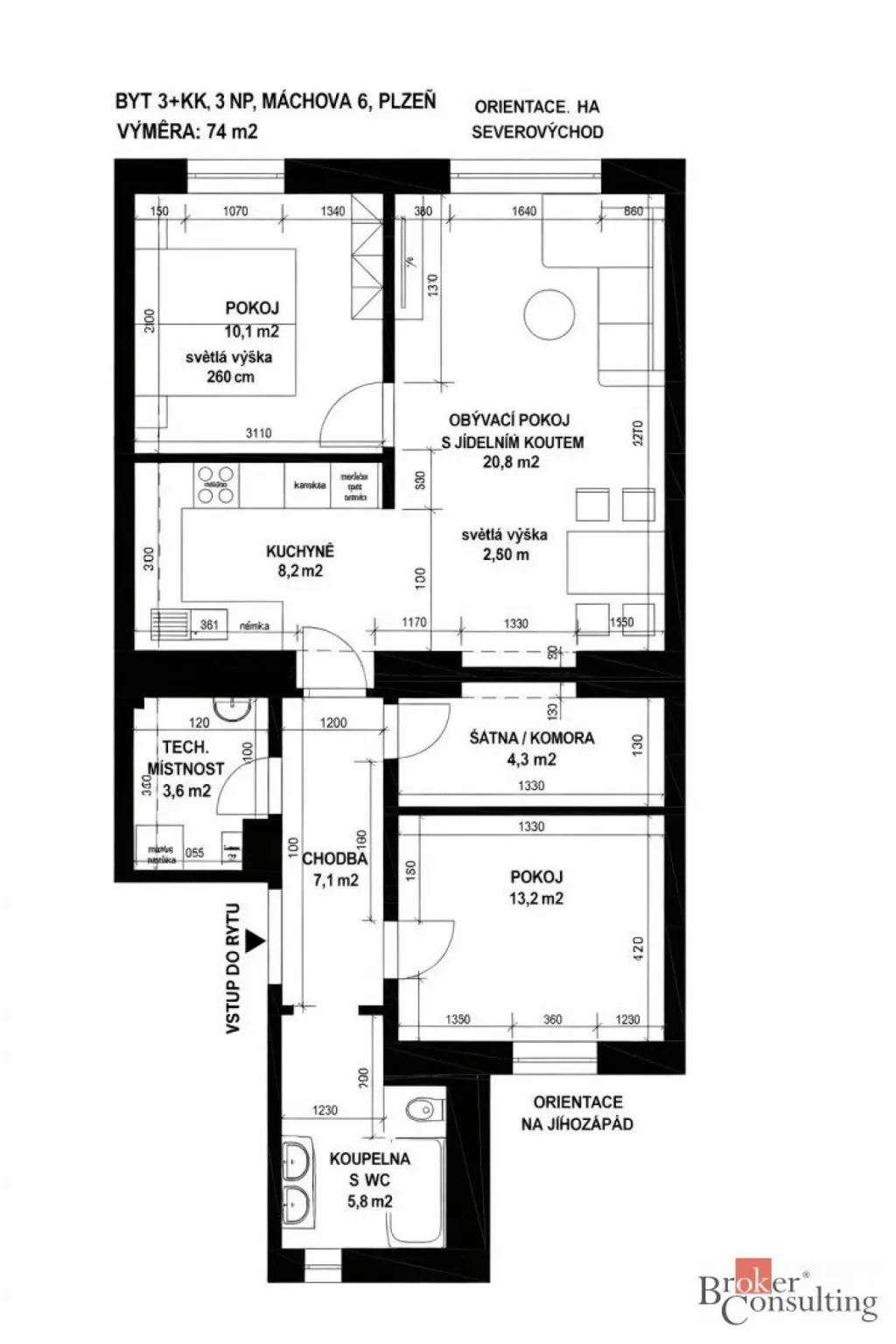 Tento světlý a skvěle dispozičně řešený byt prošel v roce 2018 kompletní rekonstrukcí. Užitná plocha samotného bytu činní 74m2. Bytovou jednotku tvoři prostorná předsíň s chodbou, koupelna s toaletou, dětský pokoj, šatna, technická místnost, kuchyňský kout s jídelnou a obývacím pokojem, ze kterého je přímý vstup do hlavní ložnice.
