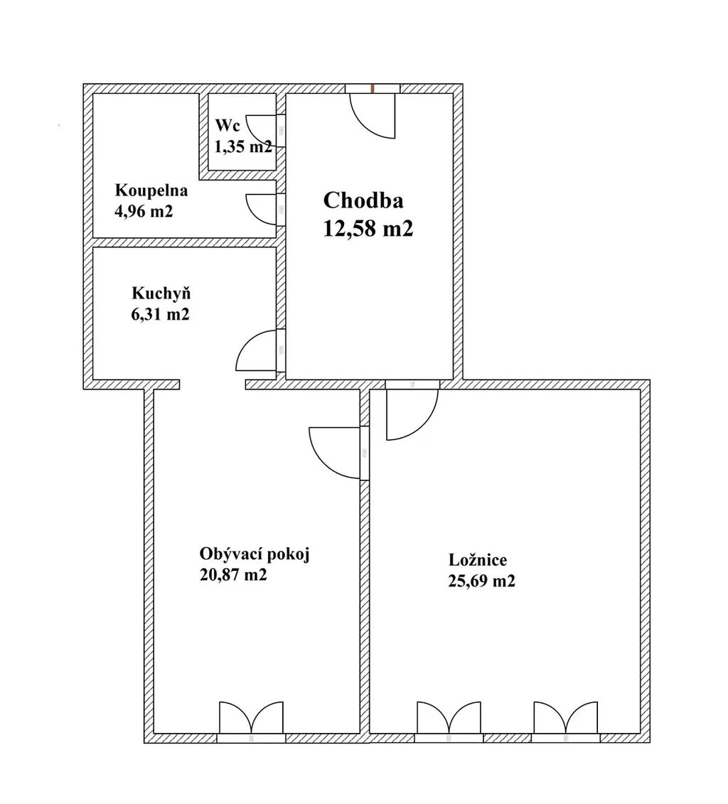 Byt se nachází ve 2. nadzemním podlaží udržovaného domu a nabízí podlahovou plochu 71,76 m². K bytu dále náleží komora na patře (0,99 m²) a sklep (3,94 m²), celková užitná plocha tak činí 77,68 m².
