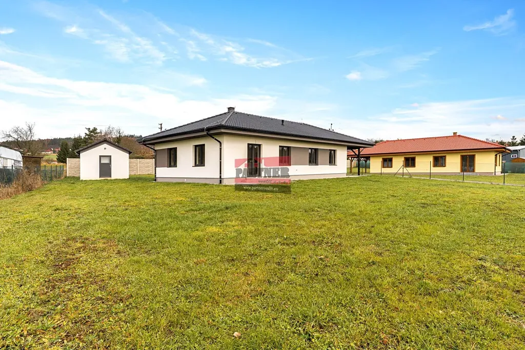 Tento světlý a útulný bungalov nabízí promyšlenou dispozici – prostorné zádveří, velký obývací pokoj s kuchyňským koutem a přímým vstupem na terasu, tři samostatné pokoje, koupelnu se sprchovým koutem, samostatné WC a chodbu s druhým vstupem do domu. Kvalitní vinylové podlahy podtrhují moderní a příjemnou atmosféru interiéru. K domu náleží přístřešek (27 m²), zahradní domek (19 m²) a rozlehlý pozemek o velikosti 1 404 m², který je kompletně oplocený a opatřený elektrickou vjezdovou bránou.