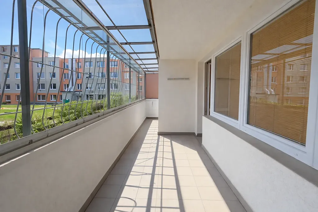 Byt disponuje prostornou lodžií o ploše cca 16 m², která nabízí příjemné místo k relaxaci s výhledem do zatravněného vnitrobloku s dětským hřištěm ohraničeného okolními budovami. Zasklení lodžie snižuje tepelné ztráty, případnou prašnost a hlučnost. Bezpečnost bytu posiluje světlá kovaná mříž na zábradlí lodžie a bezpečnostní dveře u vstupu do bytu.