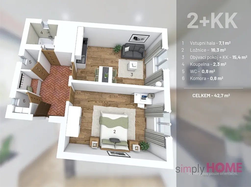 Byt se skládá se předsíně, obývacího pokoje s kuchyňským koutem, ložnice, koupelny s vanou a WC. Obývací pokoj a ložnice jsou orientovány na Severozápad do ulice Kovářská.