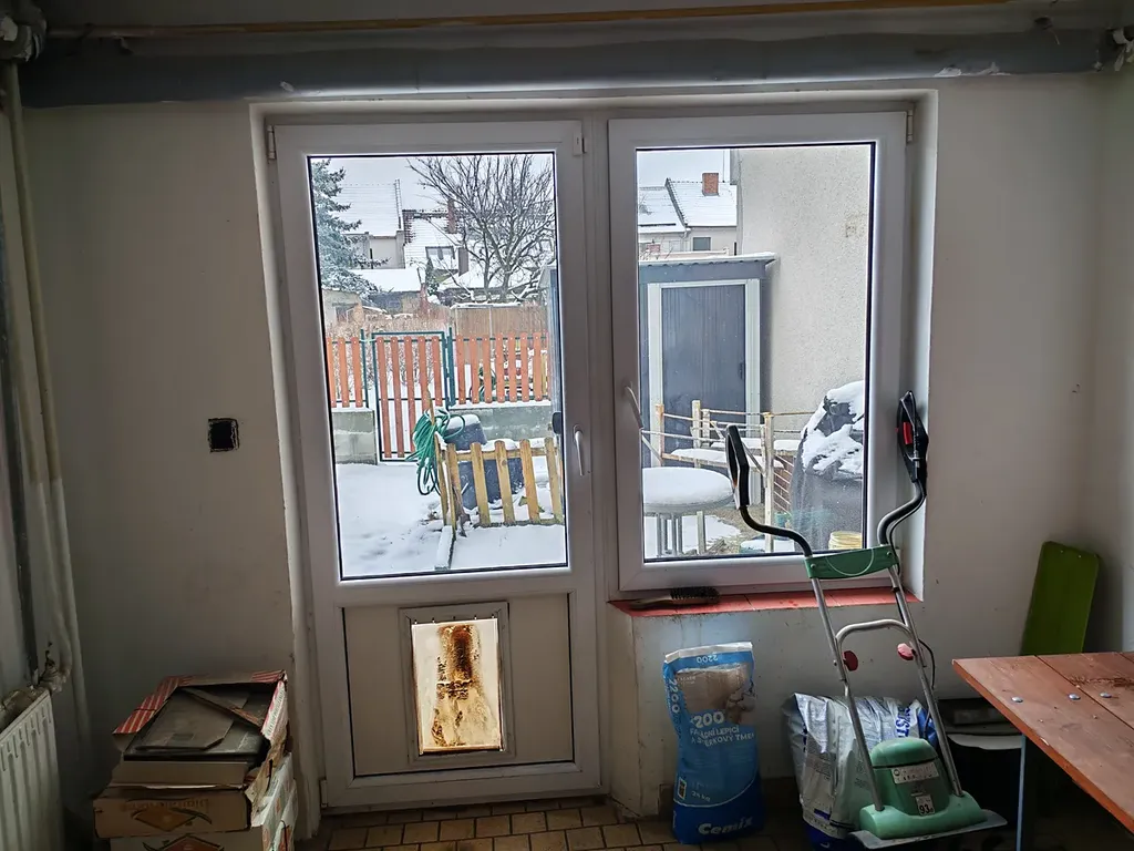 Podlahy plovoucí, dlažba a beton s koberci, okna a externí dveře plastová, interiérové dveře dřevěné, prosklené.