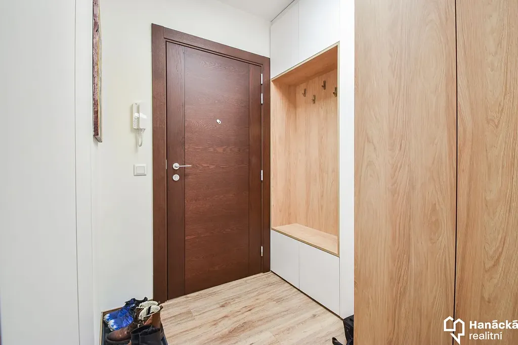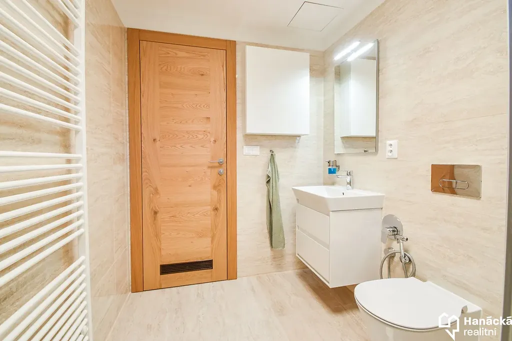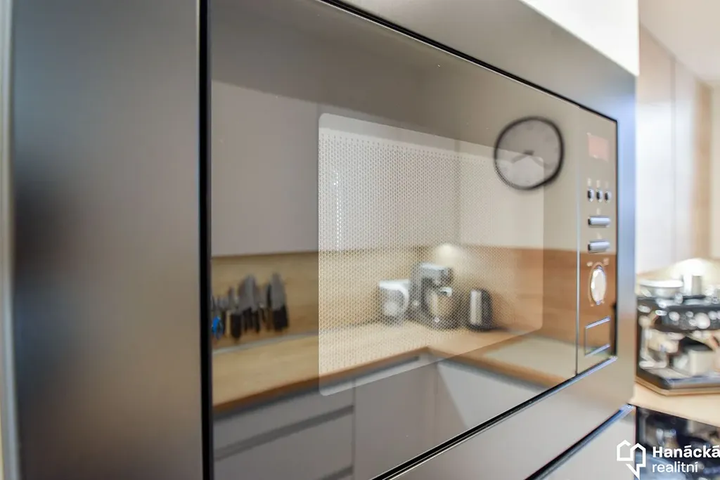 Kuchyňská linka je osazena prémiovými vestavnými spotřebiči (trouba, mikrovlnná trouba, myčka, indukční varná deska) a nechybí ani stylová vinotéka. Koupelna nabízí prosklený sprchový kout s designovým sprchovým sloupem Ideal Standard, který kombinuje relaxační hlavovou sprchu s praktickou ruční sprchou. Toaleta je pro vyšší hygienický standard vybavena bidetovou sprchou. V předsíni je v rámci vestavné skříně chytře umístěna pračka se sušičkou. Součástí nájemného je již vysokorychlostní internet (250 Mb/s) a společná TV anténa.