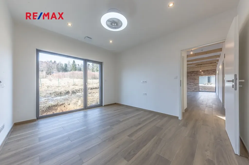 Součástí domu jsou tři ložnice, koupelna se sprchovým koutem a toaletou, druhé samostatné WC, technická místnost a šatna. Velkým benefitem je, že z každého pokoje je přímý vstup na zahradu, což vytváří velmi příjemné propojení s okolní přírodou.