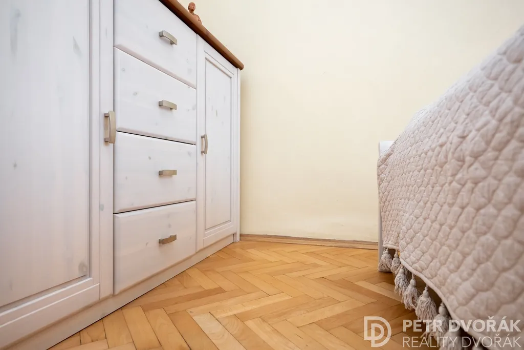Z obývacího pokoje se vstupuje do ložnice, kde velkorysá kastlová okna s hlubokými špaletami pokračují ve svém dialogu s historickou ulicí, a přilehlou koupelnou se sprchovým koutem, toaletou a pračkou. K bytu náleží vlastní sklepní kóje 1,5 m².