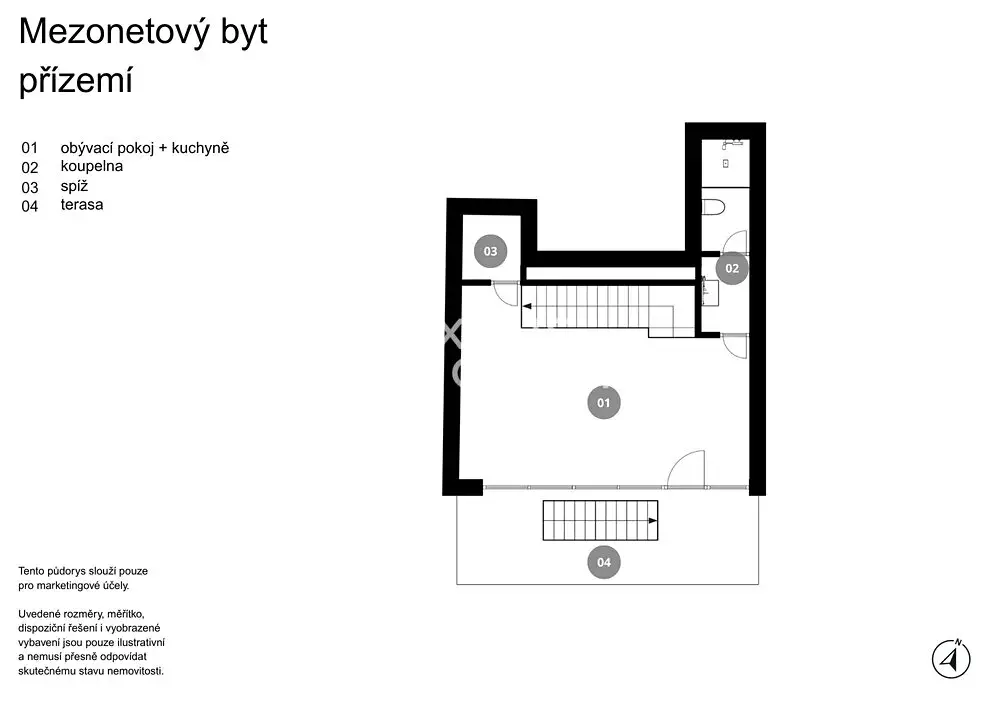 Spodní podlaží tvoří otevřený a prosvětlený obytný prostor s moderní kuchyní a přímým vstupem na terasu. Ta nabízí dostatek soukromí a příjemné místo pro každodenní relaxaci i společenské chvíle. Součástí tohoto podlaží je také koupelna s toaletou.