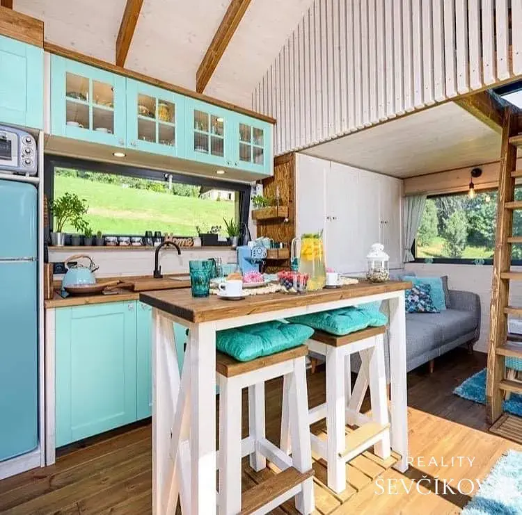 Mobilní dům je kompletně vybaven stylovým, zánovním nábytkem v moderním boho stylu a vše je součástí kupní ceny.