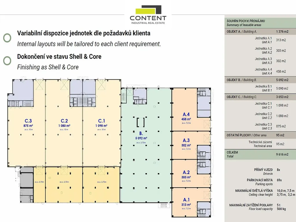 - celková pronajímatelná plocha v jednom celku až 1376 m² (celá budova A)