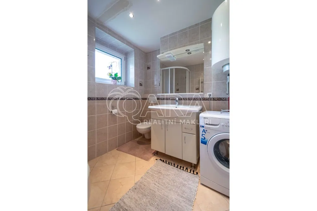 Dispozice bytu o velikosti 43 m2: vstupní chodba se šatní skříní, koupelna se sprchovým koutem, pračkou a WC mísou. Kuchyně se spotřebiči (el. trouba, varná deska, digestoř) + obývací pokoj. Teplá voda zajištěna vlastním bojlerem, vytápění el. přímotopy. K bytu patří sklepní kóje.
