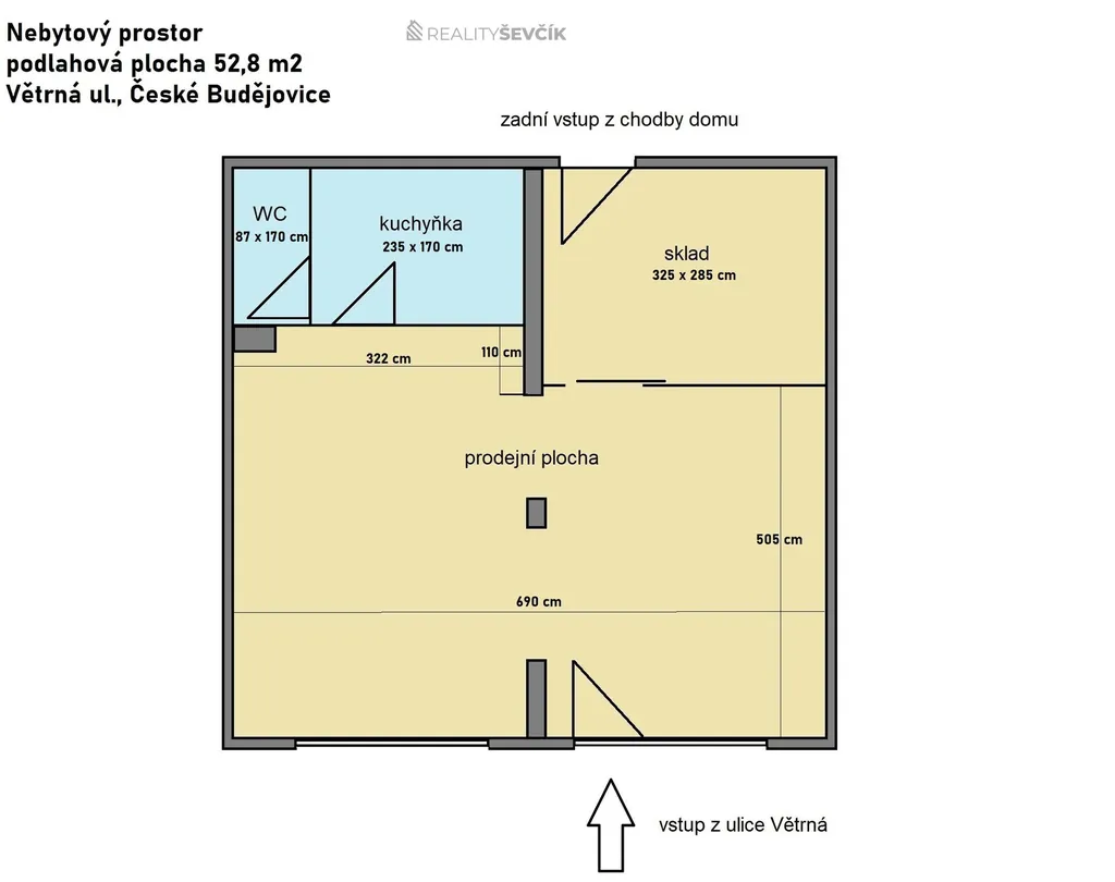 Obchod disponuje výkladní skříní a vchodem z ulice Větrná, obchodním prostorem o výměře 38 m2 a samostatným skladem o výměře 9,26 m2 (možno zrušit a zvětšit hlavní prostor). Obchod napojen na kamerový systém a zabezpečen alarmem.