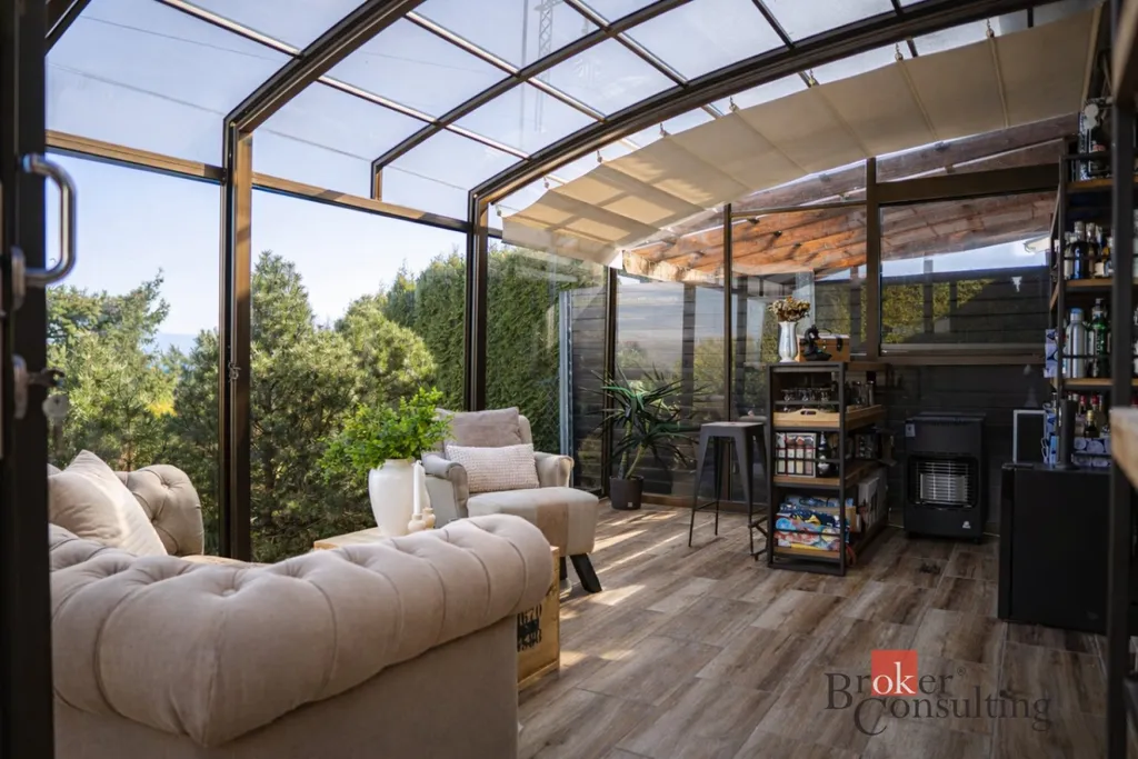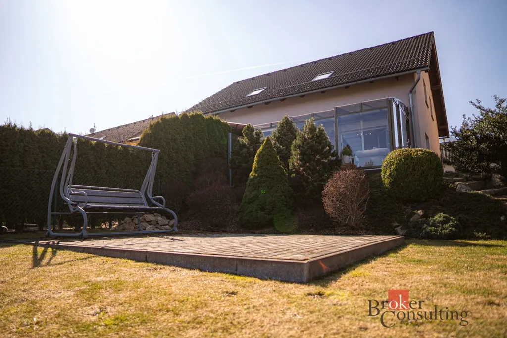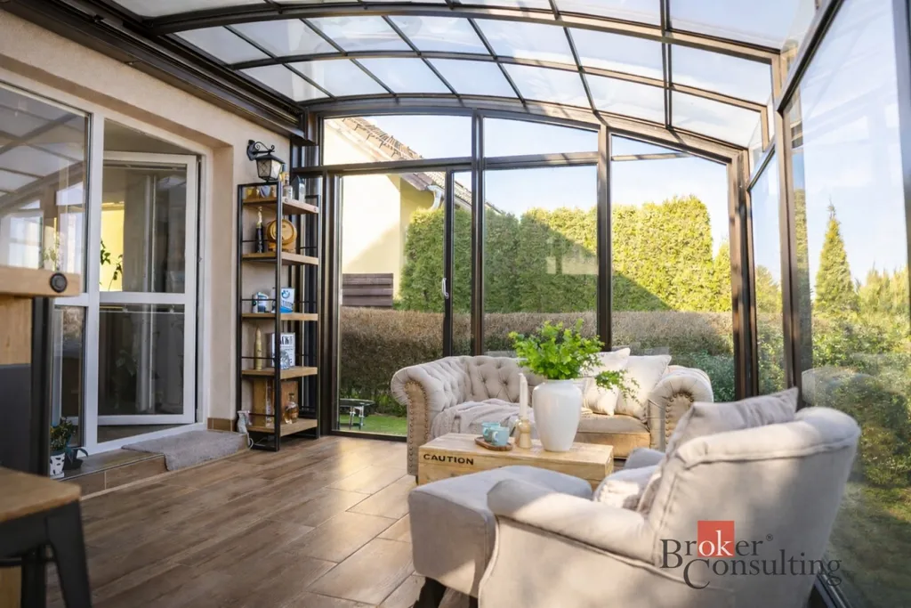 Výjimečným prvkem domu je prostorná zimní zahrada s podlahovým vytápěním, která umožňuje celoroční využití. Díky posuvným stěnám lze prostor v teplých měsících propojit se zahradou a vytvořit příjemné místo pro relax, rodinné posezení či setkávání s přáteli.