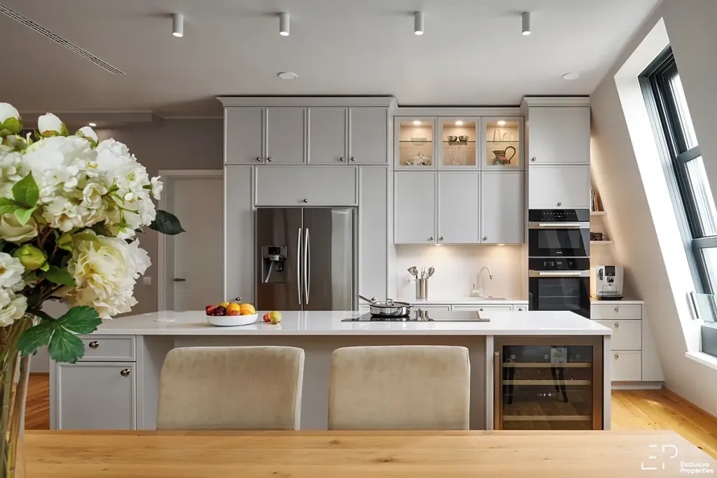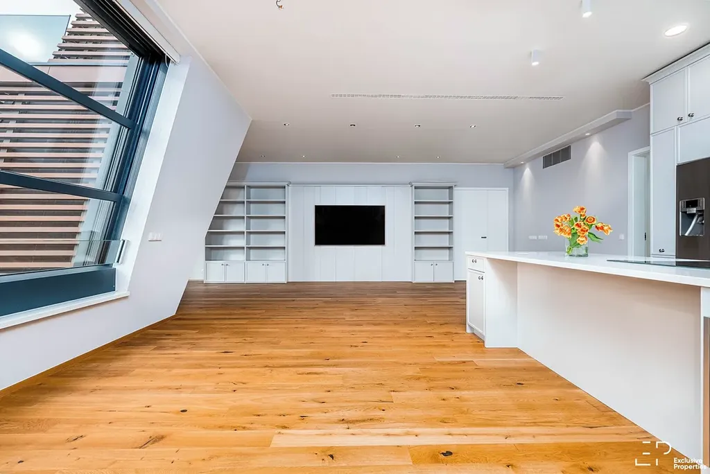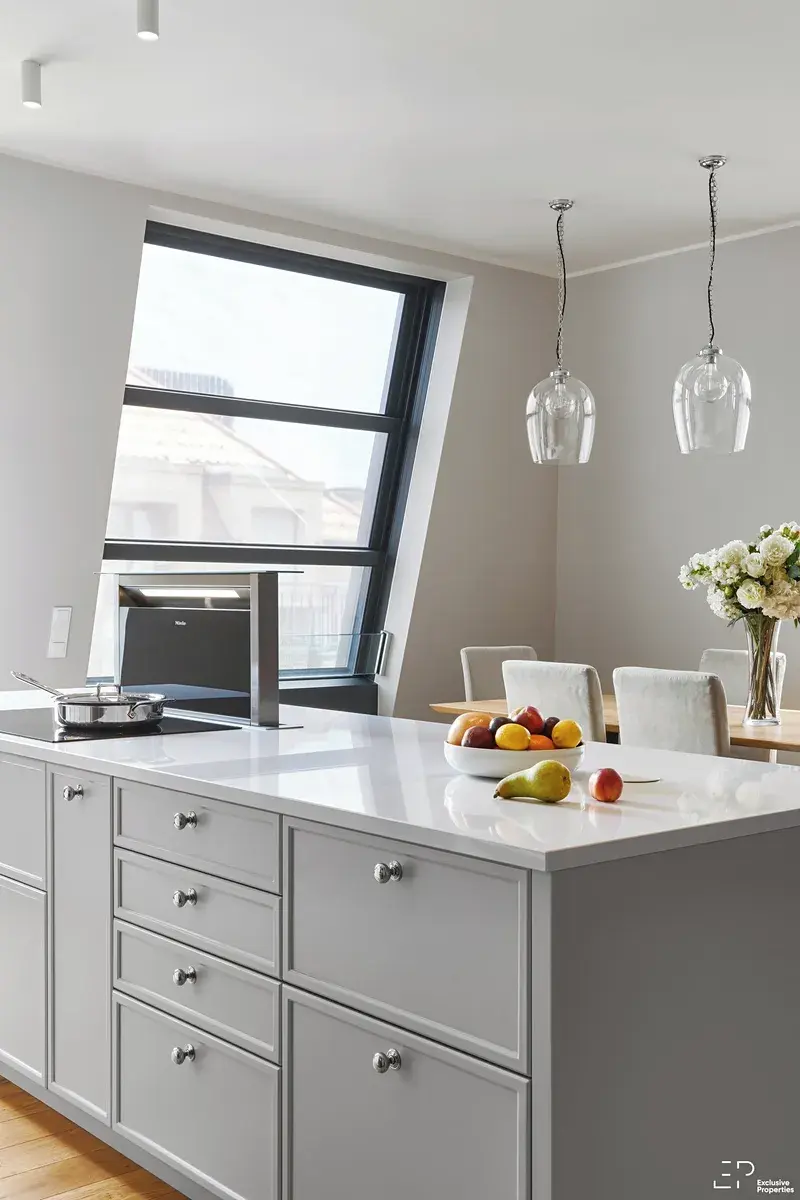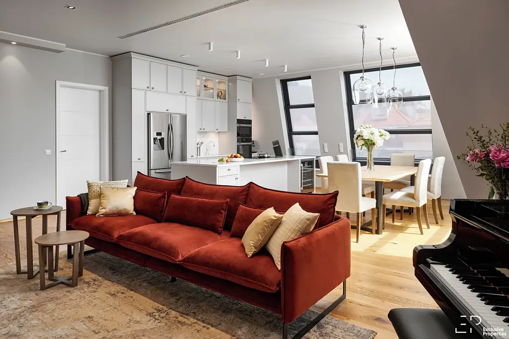 Dominantou bytu je prosvětlený, velkorysý, obývací prostor s kuchyní a jídelní částí (62m2), který plynule navazuje na jižně orientovanou terasu (12,8m2). Propojení interiéru s exteriérem vytváří harmonické prostředí pro každodenní život i chvíle odpočinku. Interiérový vestavěný nábytek je zde kompletně realizován na míru s důrazem na detail, funkčnost a čistotu designu – vše od společnosti Hanák. Knihovna s TV stěnou v obývací místnosti a kuchyňská linka ve světle šedivé barvě jsou v kuchyni doplněny bílou deskou (Technistone), čímž vzniká jednotný a nadčasový vizuální koncept. Samozřejmostí jsou spotřebiče Miele s elektricky vyjíždějící digestoří a vinotéka.