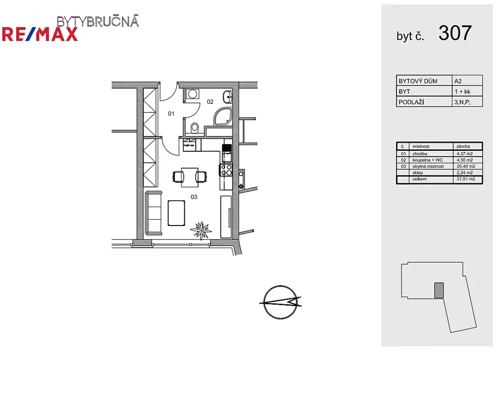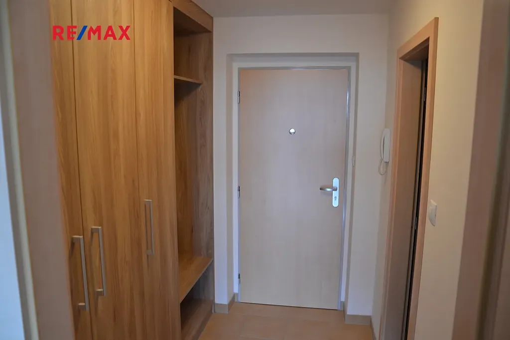 Byt je vybaven moderní kuchyňskou linkou se sklokeramickou varnou deskou, multifunkční el. troubou, lednicí s mrazákem, myčkou nádobí a jídelním stolem. V chodbě bytu nabízí úložný prostor vestavěná šatní skříň, v pokoji je stolek pro TV. Koupelna je se sprchovým koutem a toaletou.