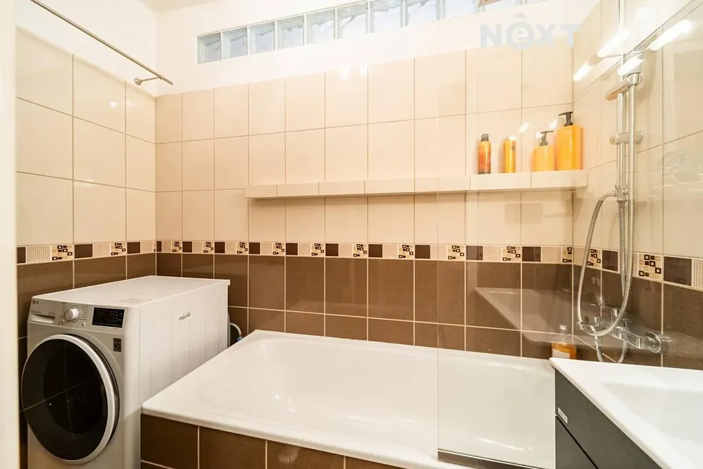Koupelna je vybavena vanou se zástěnou, což umožňuje jak pohodlnou koupel, tak i sprchování.