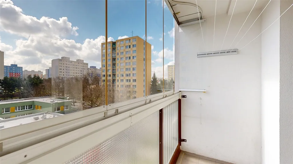 Součástí bytu je prosklená lodžie o výměře 5,5 m², která příjemně rozšiřuje obytný prostor a nabízí možnost celoročního využití. K bytu dále náleží také sklepní kóje o velikosti 1 m².