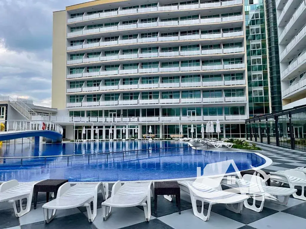 Dispozice: obývací pokoj s kuchyňským koutem, odpočinková část, koupelna, balkon s výhledem na bazén