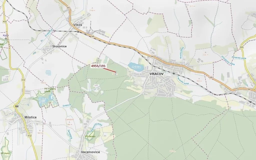 Lesní pozemek o výměře 1174 m2, parcelní číslo 4955/191, podíl 1/1, katastrální území Vracov, obec Vracov, obec s rozšířenou působností Kyjov, okres Hodonín, Jihomoravský kraj.