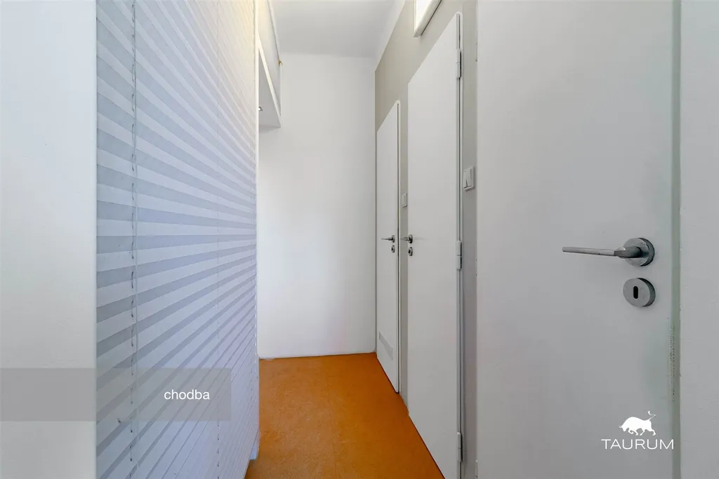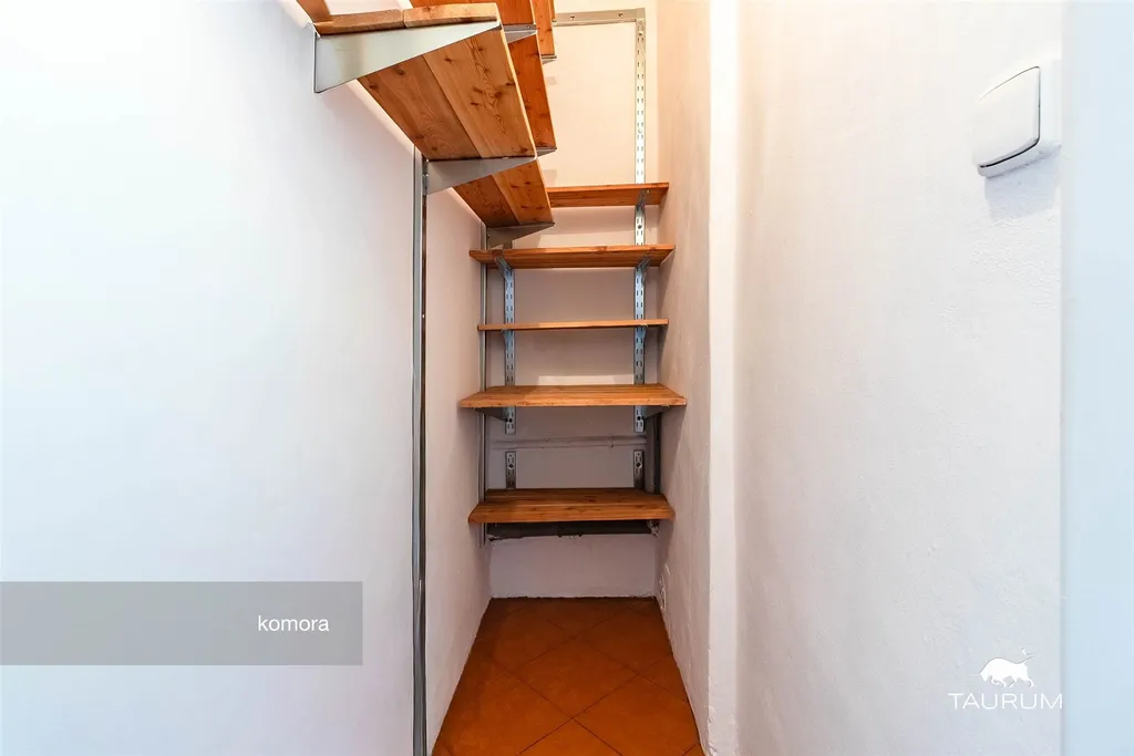 K bytu patří pěkný zděný sklep v suterénu domu včetně stěnově umístěných kvalitních regálů Element s modřínovými policemi. V domě je prostorná kolárna/kočárkárna patřící jen k tomuto vchodu. Parkování je bez zón v okolí domu.