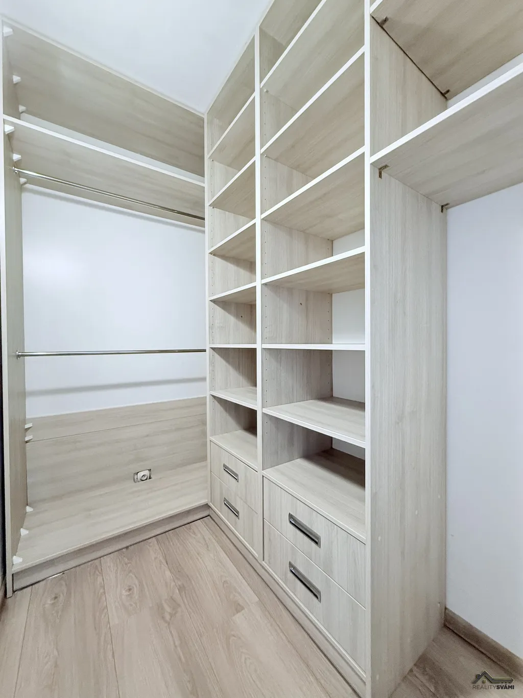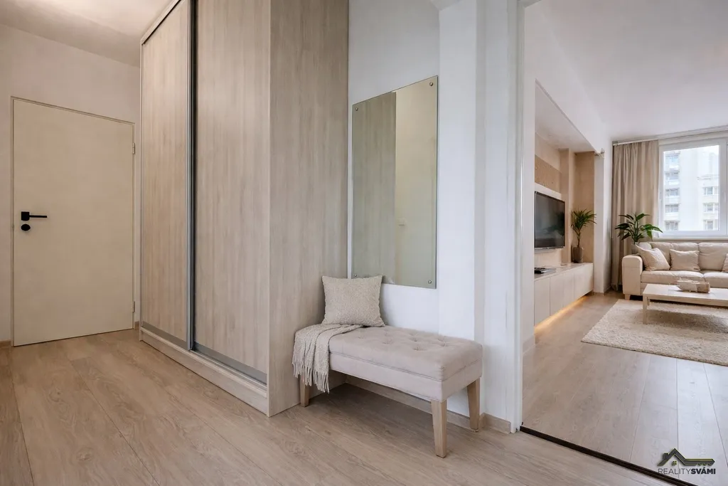 Součástí bytu je také komora využívaná jako šatna, kde zůstává vestavěný úložný systém a díky tomu již nepotřebujte mít skříně v ložnici. Další úložný prostor nabízí vestavěná skříň v chodbě, která je rovněž součástí prodeje.