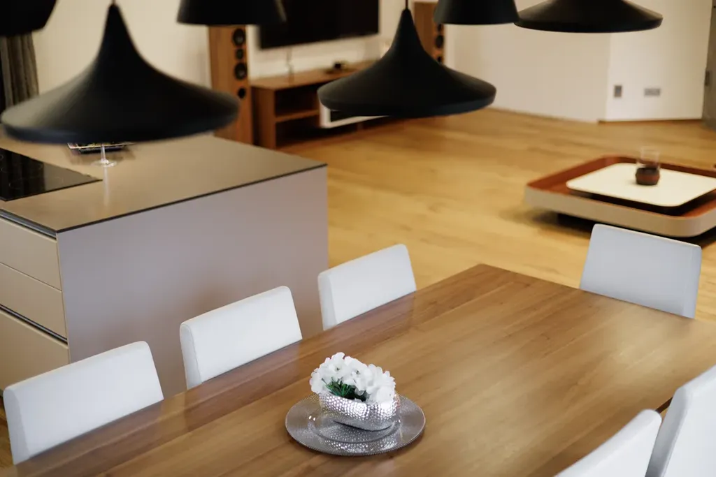Velká okna od podlahy až ke stropu poskytují nepřerušované výhledy do okolní krajiny a prosvětlují interiér. Na většině oken jsou venkovní žaluzie, které zajišťují ochranu před sluncem a zároveň poskytují soukromí. Podlahy jsou z kvalitního dubového dřeva, obývací pokoj je vybaven krbem a kuchyňské linky jsou vybaveny spotřebiči Miele. Vytápění je zajištěno podlahovým topením, které je rozvedeno prakticky po celém domě, u větších oken je doplněno o podlahové radiátory. Krbová vložka je teplovodní, napojená na tepelnou soustavu, což umožňuje vytápění i pomocí krbu. Dvojgaráž a další parkovací místo na pozemku zajišťují dostatek parkovacích kapacit. Dům je chráněn zabezpečovacím systémem a napojen na PCO (pult centralizované ochrany).