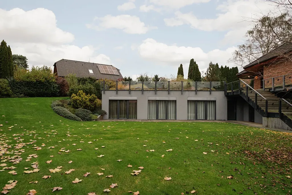 V polozapuštěném suterénu se nacházejí dvě ložnice, v současnosti využívané jako dětské pokoje, pokoj pro hosty, společenská místnost s barem, prostorná koupelna, separátní WC, menší kuchyňská linka a technická místnost. Všechny místnosti mají přímý přístup do zahrady.