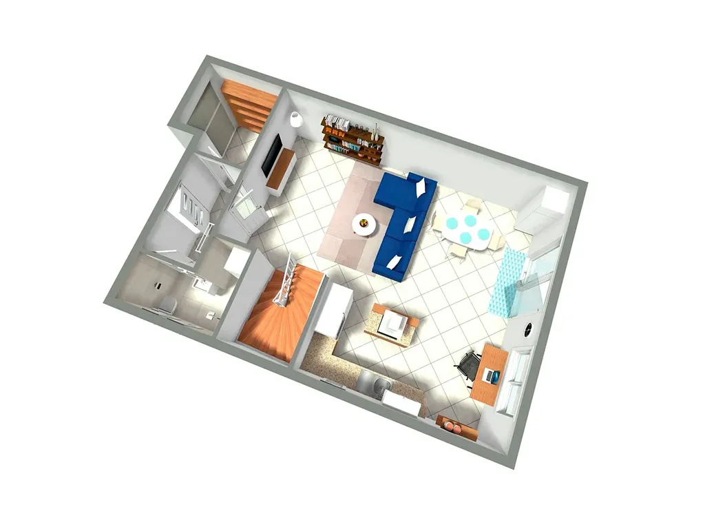 - obývací pokoj s kuchyňským a jídelním koutem s vchodem na terasu, koupelna,