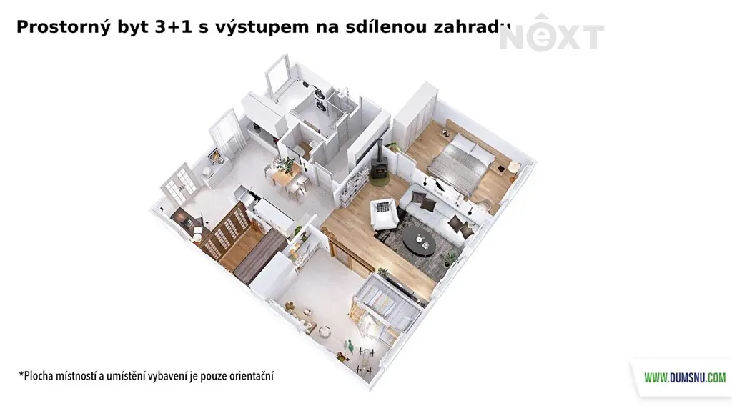 Dispozičně byt nabízí vstupní chodbu, koupelnu s vanou i sprchovým koutem, samostatnou toaletu, kuchyni, velký obývací pokoj a dva neprůchozí pokoje. Za kuchyní se navíc nachází další praktický prostor, který může sloužit jako šatna, komora nebo například pracovna.