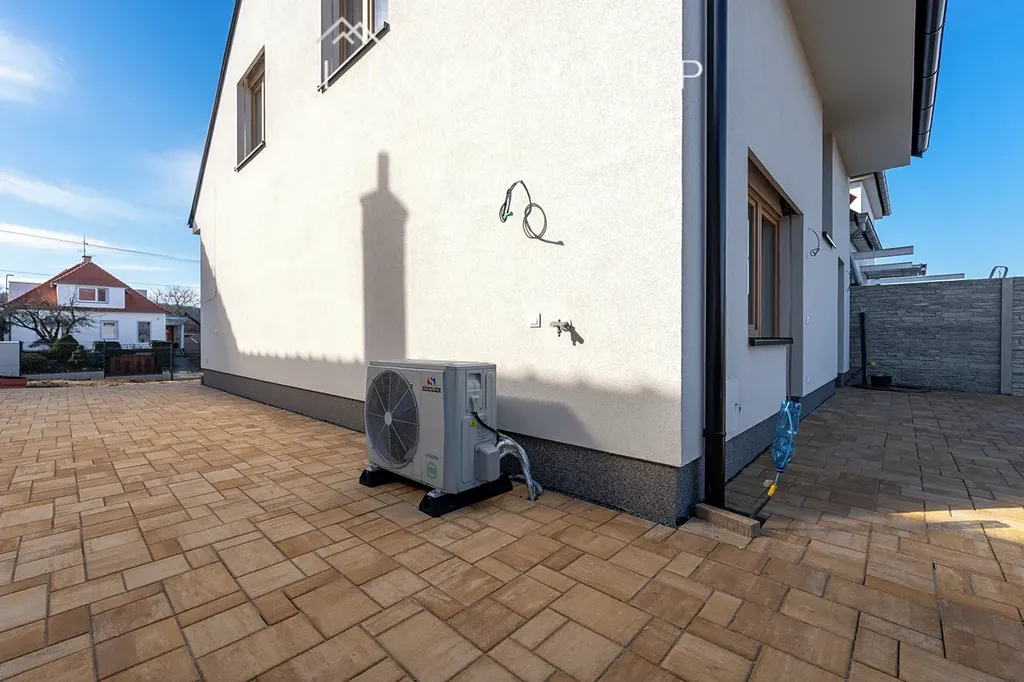 Dům je vybaven podlahovým vytápěním a rozvedenou přípravou na klimatizaci a FVE. Plastová okna Schucko s izolačním trojsklem a přípravou na hliníkové bezpečnostní rolety s elektrickým pohonem na oknech a střešní okna VELUX. Interiér je vybaven prémiovými materiály, včetně vinylových podlah, keramických obkladů, sanity a vnitřních designových dveří. O efektivní vytápění se stará tepelné čerpadlo, na které je napojen 200 l elektrický bojler, který se vyznačuje úsporným provozem. Tepelné čerpadlo vytápí, ale i chladí.